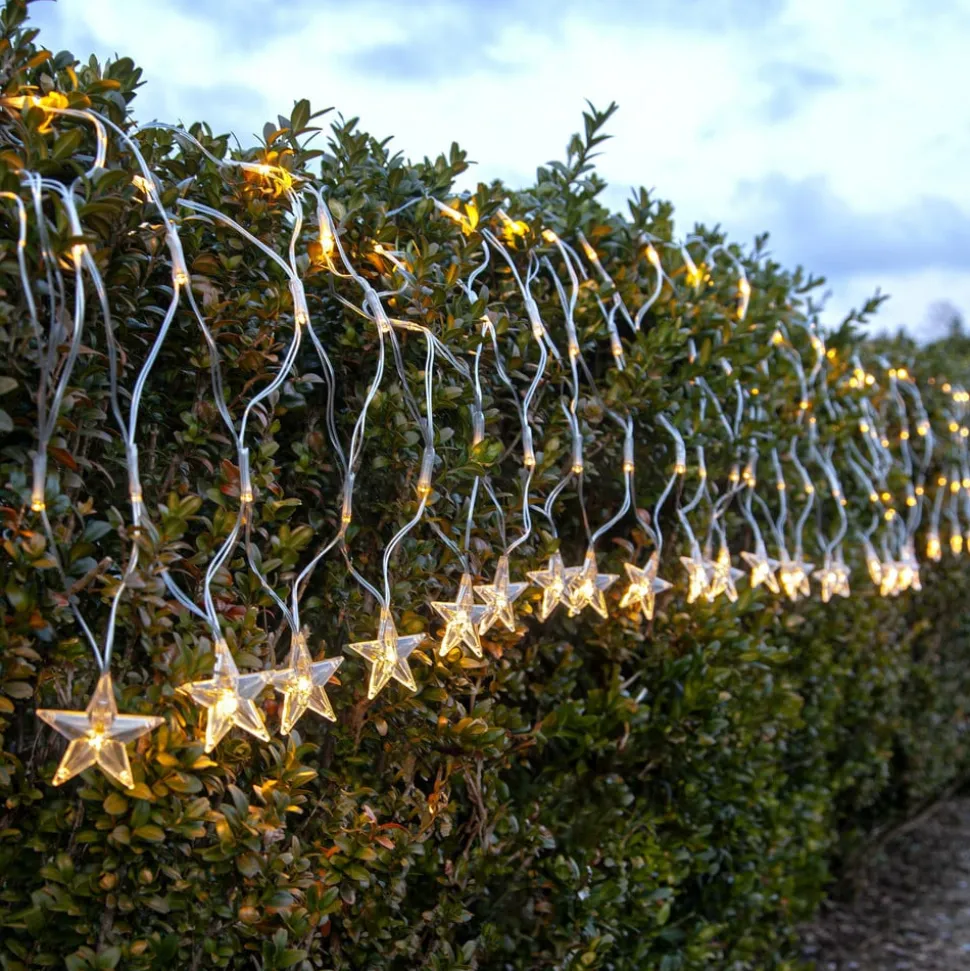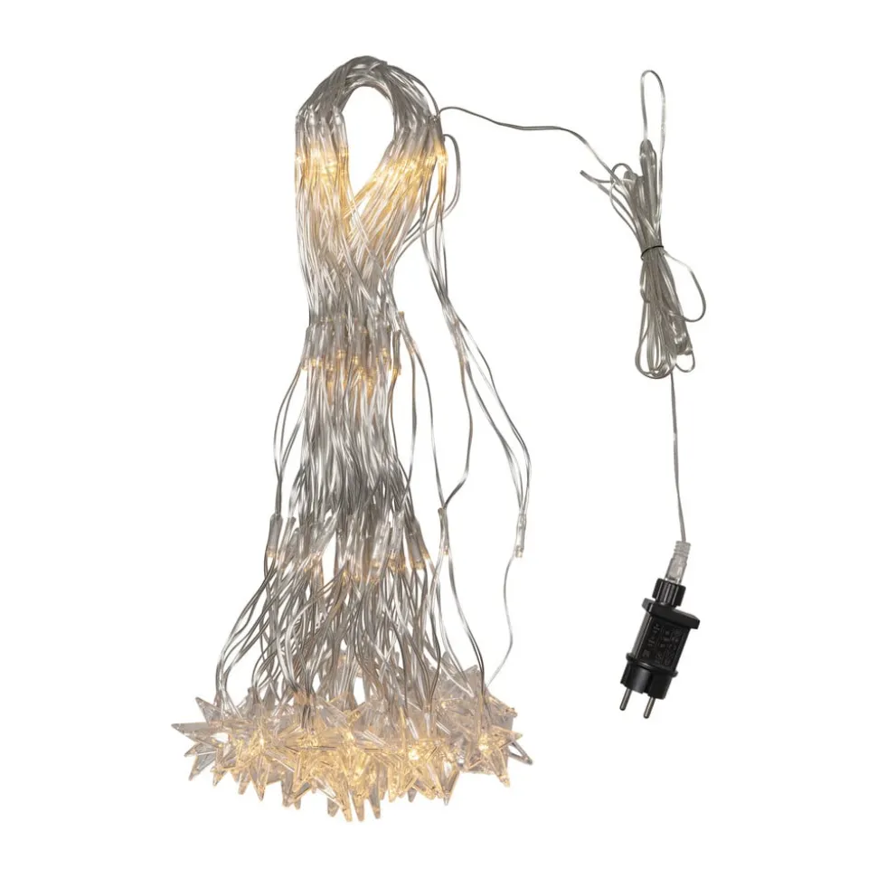 StarNet LED lichtgordijn met sterdecoratie – Kerstverlichting voor buiten Het StarNet LED lichtgordijn kan worden gebruikt om buiten feestelijk te verlichten. De ketting van doorzichtig plastic is versierd met talrijke warmwitte LED’s en heeft ook in totaal 40 sterren aan de onderkant. Voor stroomvoorziening via het stopcontact wordt een 5 m lange stekkerkabel met transformator meegeleverd. Beschermingsgraad IP44.