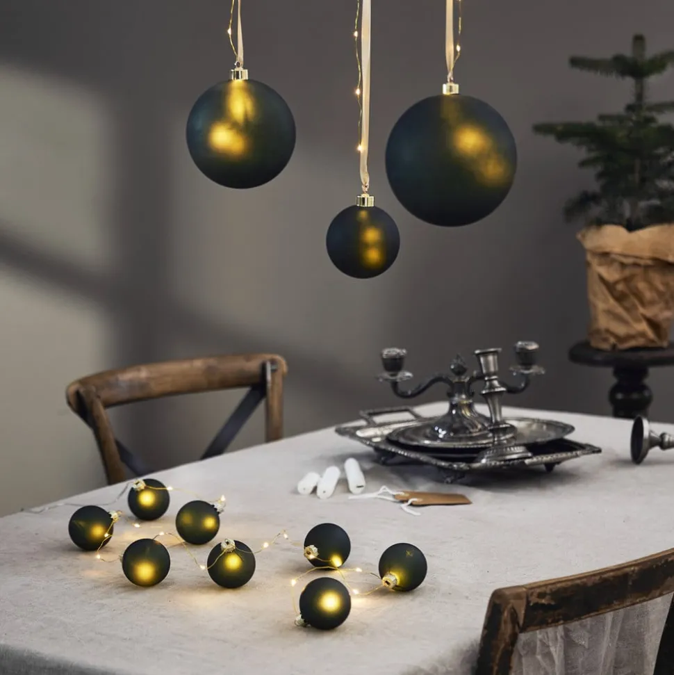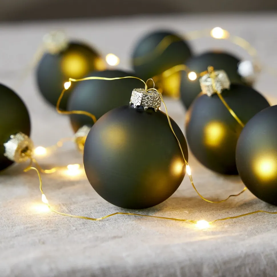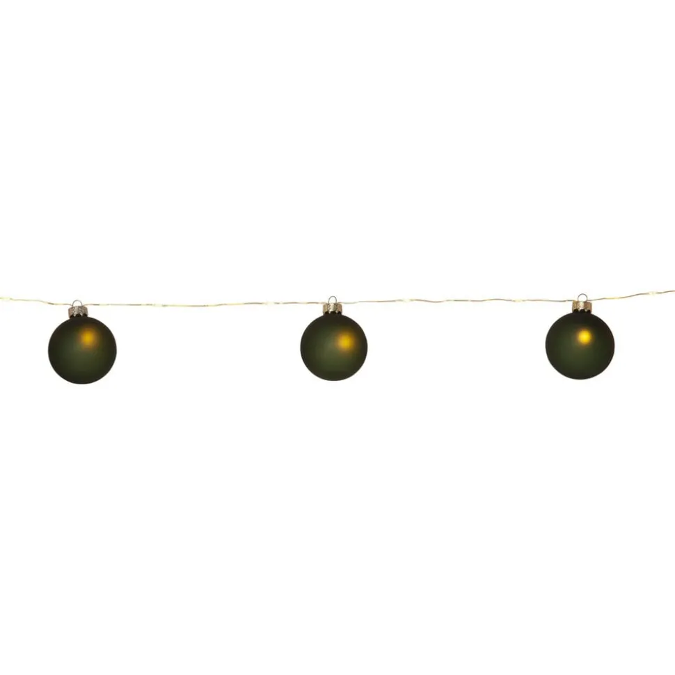 Bliss LED lichtketting op batterijen met acht donkergroene glazen bollen De Bliss LED lichtketting is een sfeervolle lichtdecoratie voor binnenshuis, vooral tijdens de kerstperiode. Acht bolvormige, donkergroene glazen staan op een rij langs de ketting en bevatten elk een warmwit LED-lampje. De stroom wordt geleverd door drie AA-batterijen (exclusief), die in een batterijvakje aan het einde van de ketting worden geplaatst. De timerfunctie (6 uur aan, 18 uur uit) maakt automatisch schakelen mogelijk.