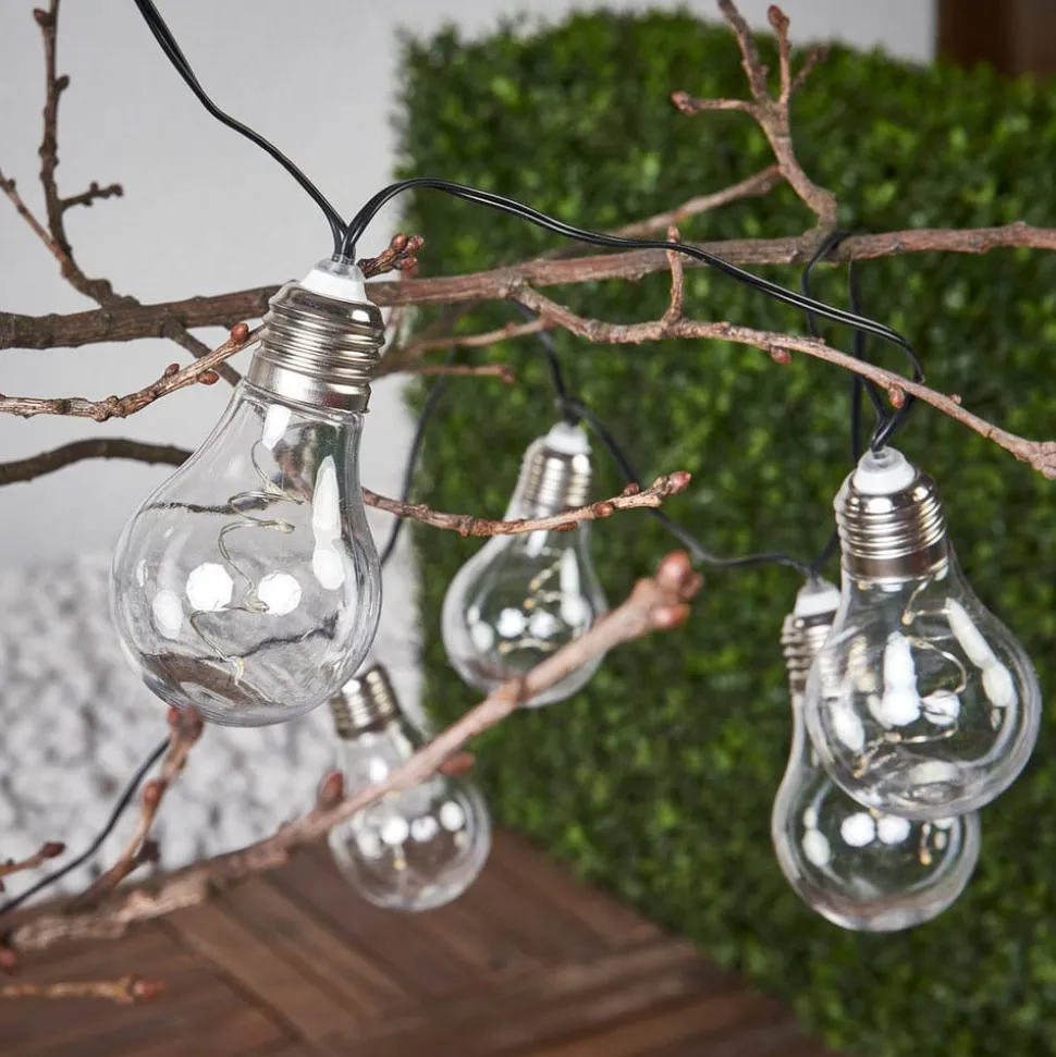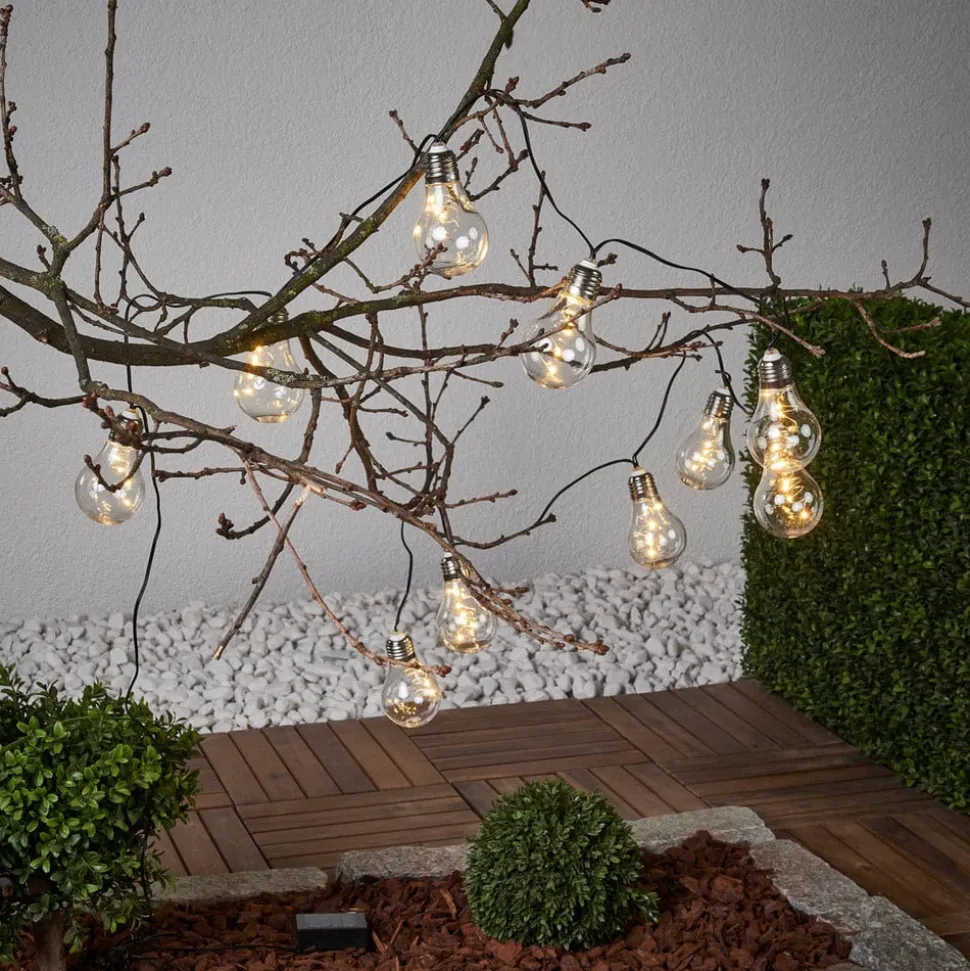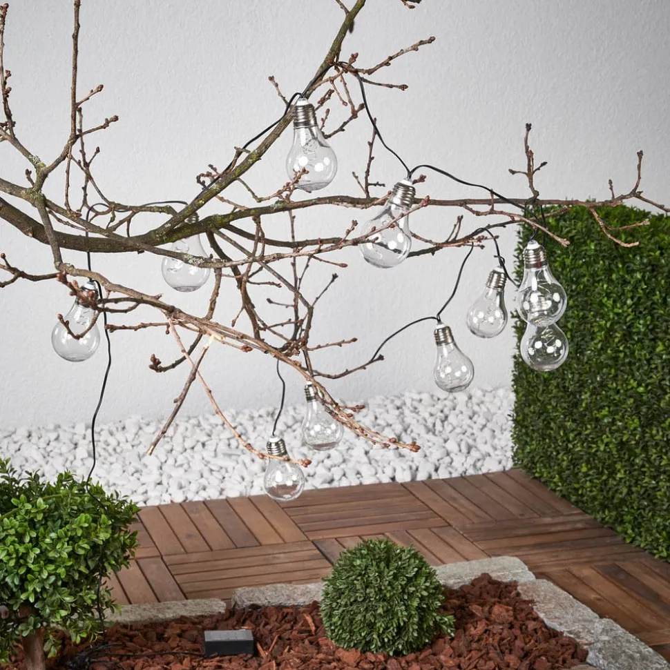 Glow LED lichtkettingen op zonne-energie met heldere lampen Op de 190 cm lange lichtkettingen staan tien heldere lampen op 20 cm afstand van elkaar, elk voorzien van warmwitte LED’s die door het heldere glas een betoverend lichteffect creëren. Tuinfeestjes of gewoon gezellige avonden op het terras kunnen sfeervol worden verlicht met de Glow heldere lichtkettingen, en dankzij de werking op zonne-energie, zonder vervelende kabels en energiekosten. Levering inclusief zonnepaneel en oplaadbare batterij (AA NiMH). De LED’s gaan automatisch aan dankzij de geïntegreerde schemersensor.