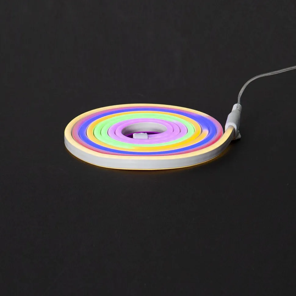 Drie meter lange Flatneon LED touwverlichting met kleurrijke LED’s De Flatneon Ropelight LED lamp schijnt in vele heldere kleuren. In tegenstelling tot veel andere touwlampen, geven de kleurrijke LED’s aan beide zijden licht. Het brede, centrale gedeelte van de platte strip is echter bedekt met wit, ondoorzichtig plastic. De kleurrijke, verlichte lichtslang is de ideale decoratie voor elk tuinfeest. Mite 5 m lange voedingskabel met Outdoor stekker en transformator.
