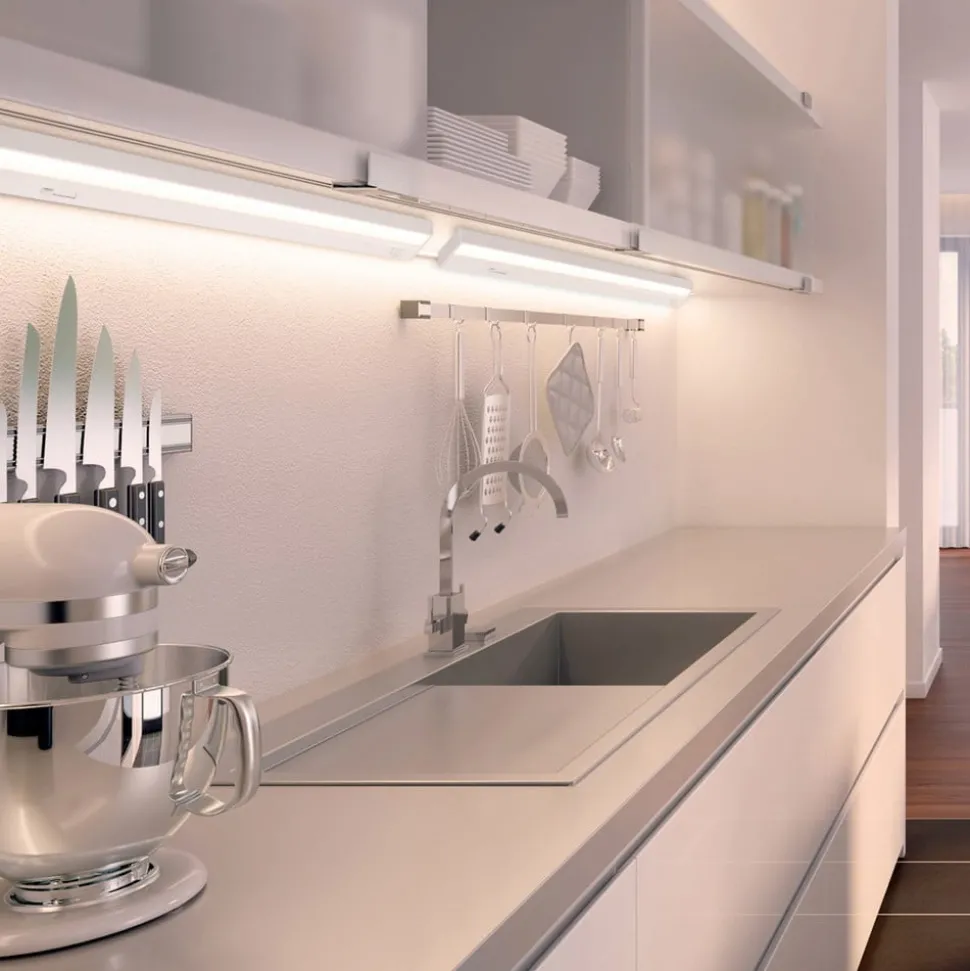 Met dimmer – Cabinet Light Dim LED onderkastlamp Met de Cabinet Light Dim LED onderkastlamp op het werkblad kan niet alleen helder, universeel wit licht voor het werk worden bereikt, maar ook gezellige en sfeervolle decoratieve of oriëntatieverlichting in de keuken, omdat de Cabinet Light Dim onderkastlamp naast de schakelaar ook is uitgerust met een dimmer, zodat de helderheid eenvoudig op de lamp kan worden geregeld. De levering bevat een 180 cm lang aansluitsnoer met stekker en een aansluitsnoer met stekkers voor het koppelen van twee lampen.