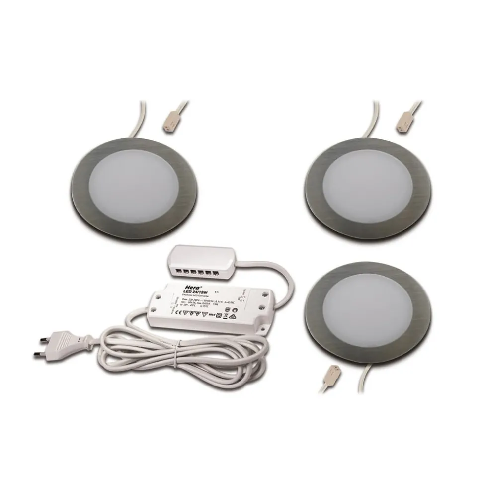 Ronde, dimbare LED meubelverlichting FAR 58 in een aansluitklare set van 3 FAR 58 is een meubelinbouwlamp met een rond frame in een roestvrijstalen look en een kunststof diffuser die ideaal past in een modieuze omgeving en ook kan worden gebruikt in badkamers en sanitaire ruimtes. Die drie lampen in de Set zijn uitgerust met aansluitkabels; de transformator die nodig is voor de werking is inbegrepen voor aansluiting op het stopcontact. Indien nodig is dimmen mogelijk met een externe controller (niet inbegrepen) – Geleverd in een set van 3 met LED transformator (230 V naar 24 V) met netstekker – Zeer goede kleurweergave: Cri Cri > 90 – Uitgerust met 250 cm lange aansluitkabel (Hera LED 24 stekker) – Minimale afstand tot naastgelegen armatuur: 5 cm