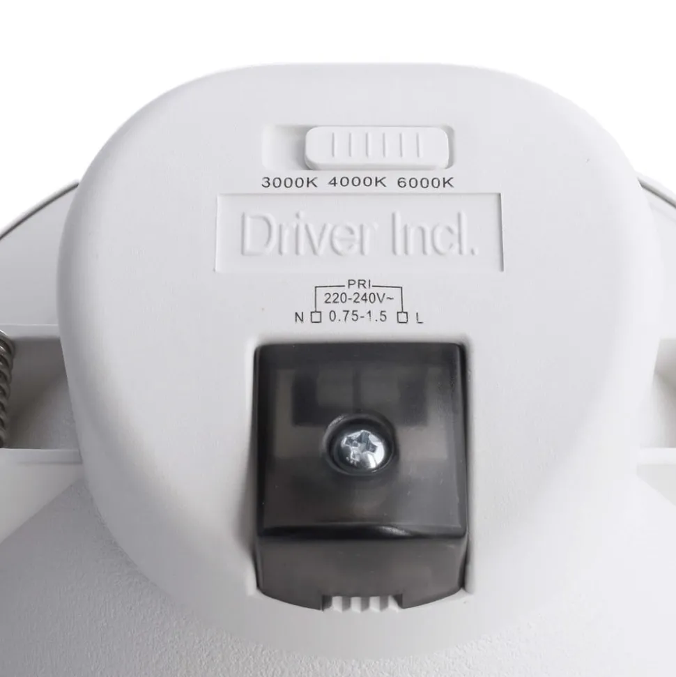 Ronde LED plafond inbouwlamp Acrux met instelbare lichttemperatuur Acrux is gemaakt van wit kunststof en wordt geleverd met een diepzwarte afdekring. De LED plafond inbouwlamp is geschikt voor 230 V directe aansluiting en is geschikt voor vele toepassingen: in de keuken, het trappenhuis of de hal, maar ook voor winkel- of gangverlichting in commerciële ruimtes. De lichttemperatuur kan in drie stappen worden geselecteerd via een dipswitch in de lichtkleuren warmwit, universeel wit en daglicht. Er zijn krachtige SMD-LED’s geïnstalleerd om het stroomverbruik laag te houden. Het licht kan ook worden gedimd met een fase-afsnijdimmer van de klant – Stralingshoek: 90° – Inschakelduur 60 % lichtstroom: 0,5 s – Ontstekingstijd: 0,5 s – Lichtuitstraling: symmetrisch – Bedrijfsmodus: constante spanning – Bedrijfstemperatuur: -5 °C – +40 °C – Vermogensfactor PF: 0,90 – Lichtsterkte: 505 cd
