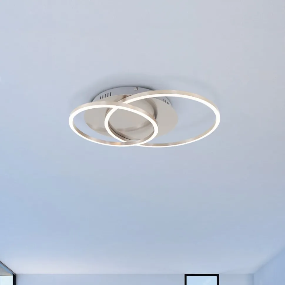 De LED plafondlamp Frames bestaat uit twee grote ringen, die offset op elkaar zijn geplaatst en voorzien zijn van LED’s. De armatuur kan een hoge lichtsterkte produceren, zodat ook grotere ruimten de juiste verlichting krijgen. Indien nodig heeft men de mogelijkheid om de helderheid in stappen aan te passen via de wandschakelaar. Door haar vormgeving is de plafondlamp geschikt voor gebruik in moderne woonruimten.