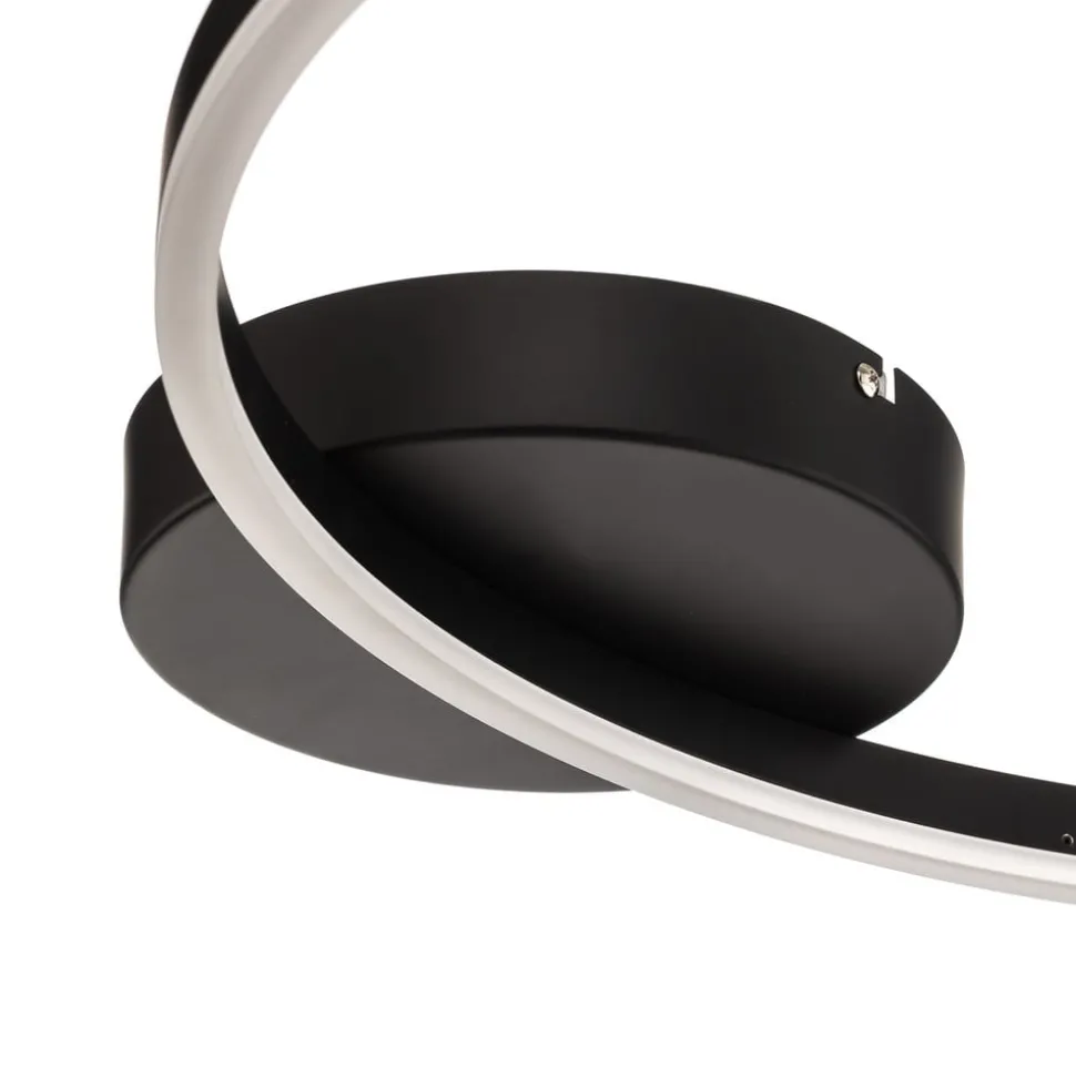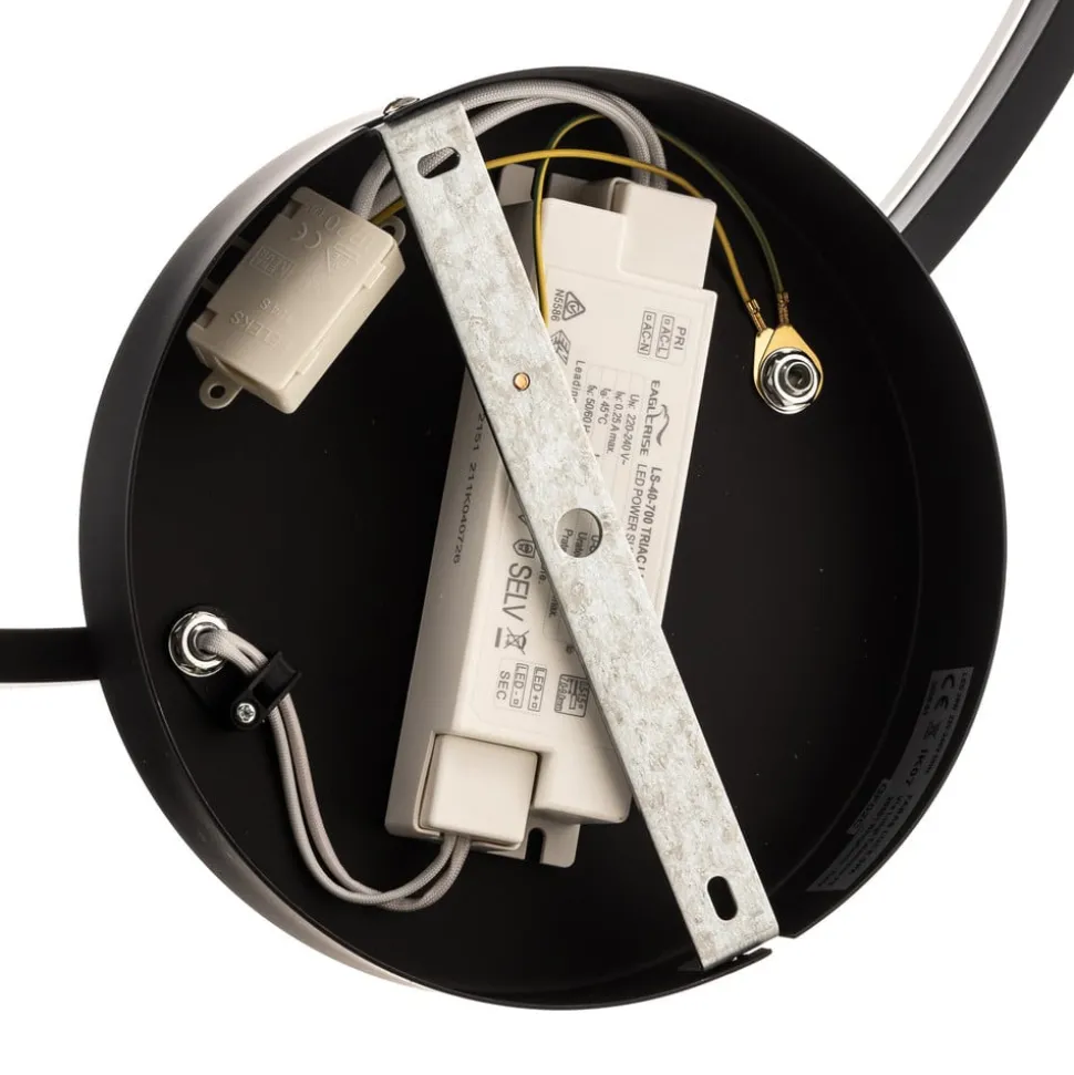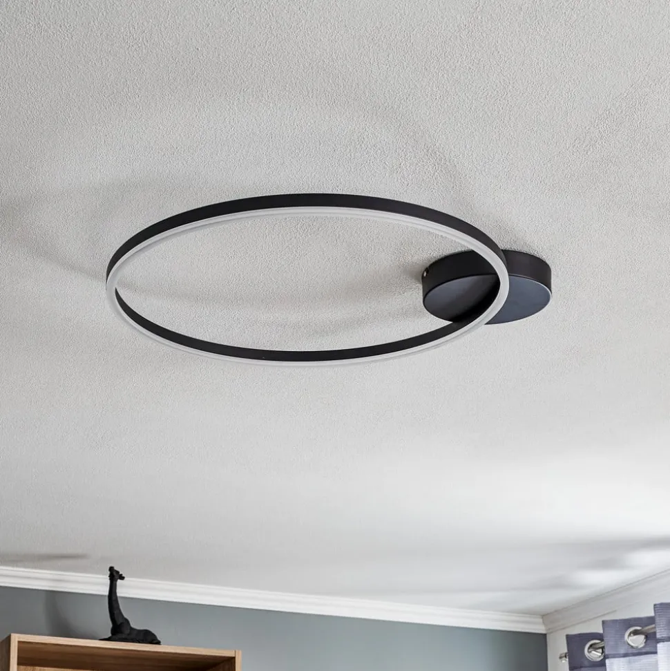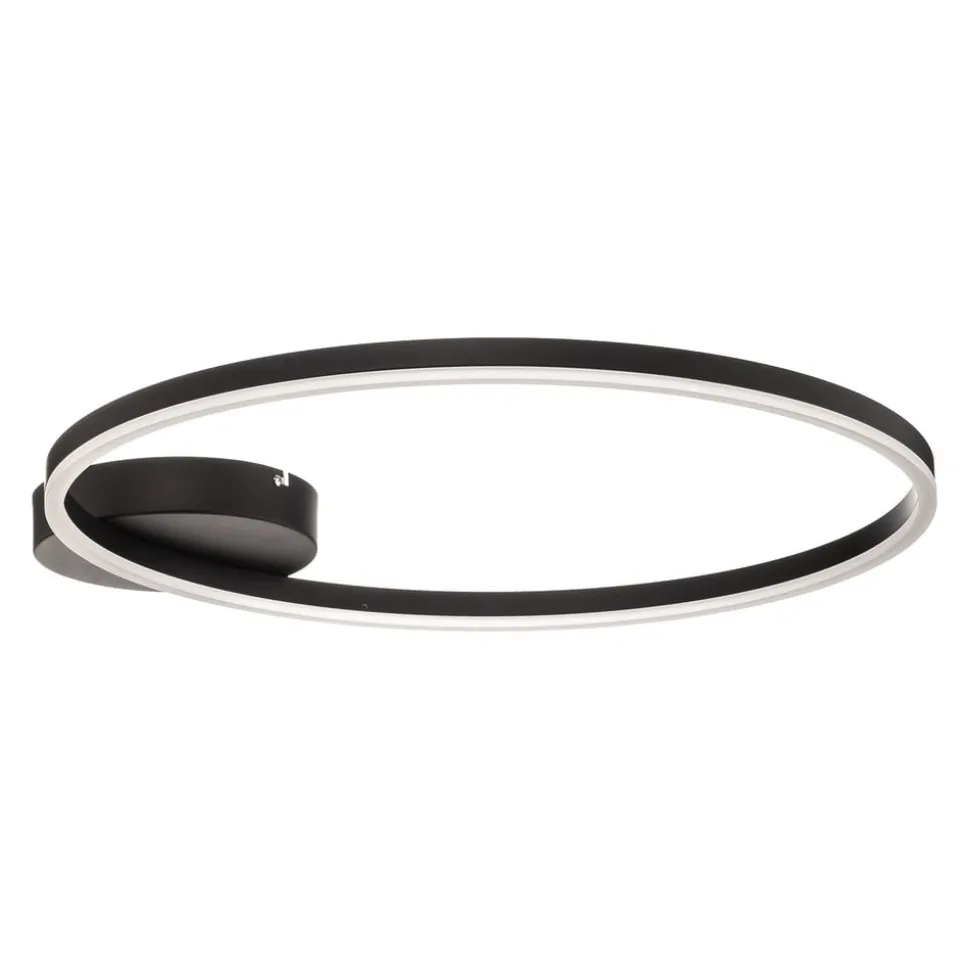 De plafondlamp bestaat uit een stevig metalen frame in zwarte kleur waarin de LED’s zich bevinden. Hij wordt met een eenvoudige ophanging aan het plafond bevestigd, wat het ontwerp van de lamp harmonieus aanvult. De hele lamp inspireert door zijn eenvoudige en elegante vorm en door zijn praktische dimfunctie.