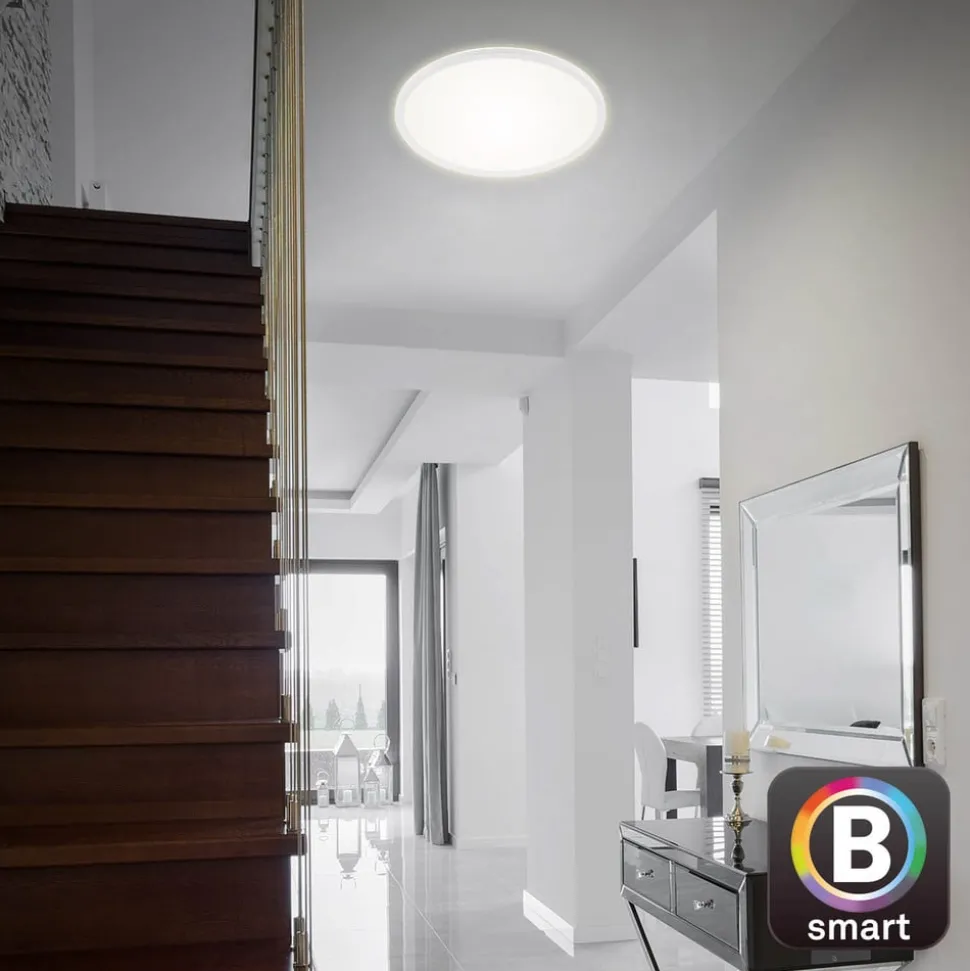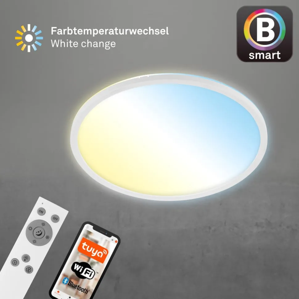 Witte LED-plafondlamp Slim S met dim- en CCT-functieEenvoudig en tijdloos past de LED-plafondlamp Slim S met haar witte kleurstelling en ronde vorm moeiteloos in verschillende omgevingen en bestaande interieurstijlen. Het hoofdlicht schijnt naar de vloer, terwijl een klein deel ook naar het plafond schijnt en zo een decoratief tegenlichteffect creëert. Slim S kan bijvoorbeeld worden gebruikt als lichtbron in de gang, in de woonkamer, in de keuken of in de slaapkamer.De LED-plafondlamp heeft een CCT-functie waarmee de kleurtemperatuur kan worden gewijzigd van warm naar daglichtwit. Bovendien kan de helderheid van het armatuur worden geregeld. Verder zijn een nachtlampje, een timer en een geheugenfunctie ingebouwd. De afzonderlijke functies worden bediend met de meegeleverde afstandsbediening, via de gratis tuya-app of met een spraakcommando.- incl. afstandsbediening- bediening via tuya-app voor iOS en Android- spraakbediening via Amazon Echo en Google Home- dimbaar- CCT-functie (2.700 – 6.500 K)- geïntegreerde timer, nachtlicht en geheugenfunctie