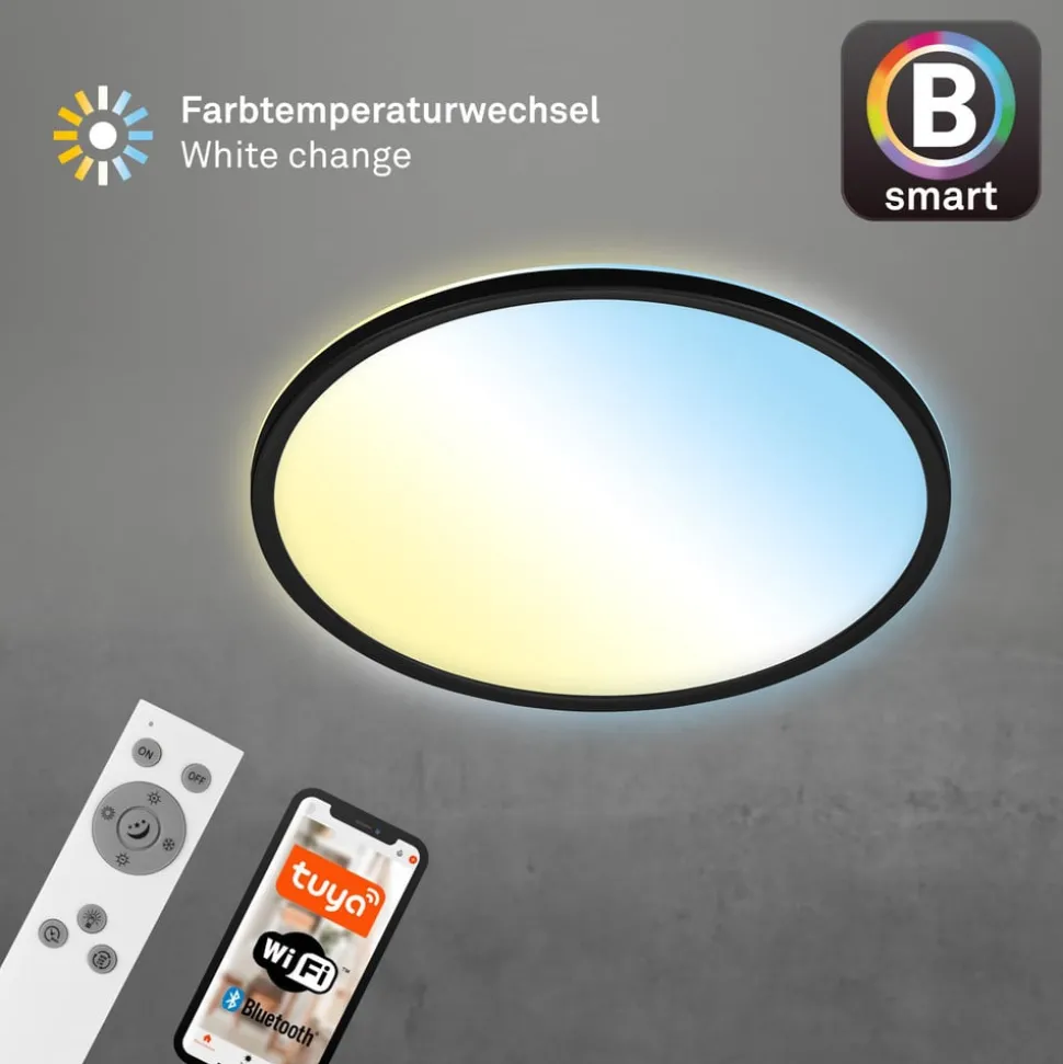 Slimme regelbare LED plafondlamp Slim met tegenlichteffect en geheugenfunctieDe slimme LED plafondlamp Slim is functiegericht en trendy. De geïntegreerde LED’s zijn gelijkmatig verdeeld achter het witte verlichte oppervlak en kunnen in kleurtemperatuur worden gewijzigd tussen gezellig warm wit en intensief daglichtwit. Bovendien kan de lichtintensiteit traploos worden gedimd om voor elke situatie de juiste lichtopbrengst te hebben – of het nu gaat om een gezellig diner of een spannende spelavond.Bovendien is de Slim uitgerust met een timerfunctie en een nachtlichtfunctie, evenals een geheugenfunctie waarmee de laatste lichtinstelling kan worden opgeslagen. Een bijzondere sfeer wordt ook gecreëerd door de geïntegreerde achtergrondverlichting, die een zacht licht op het plafond werpt en elke kamer een beetje gezelliger maakt. Speciaal voor het creëren van een onderscheidend ruimte- en lichtconcept is de Slim een originele lichtbron waarvan alle functies via de meegeleverde afstandsbediening, via spraakbesturing of met een mobiele telefoon kunnen worden bediend. – bedienbaar via WiFi-gebaseerde app (gratis voor iOS en Android)- Compatibel met Google Home en Amazon Echo voor intelligente spraakbesturing- Lichtkleuren en helderheid kunnen worden aangepast via app