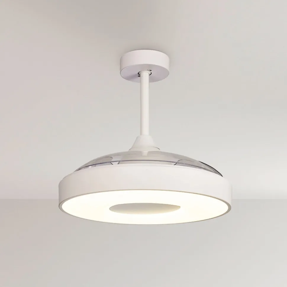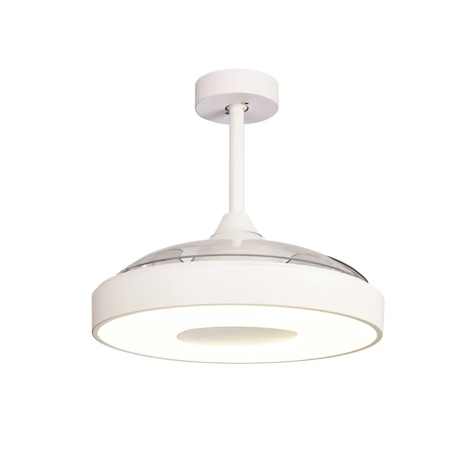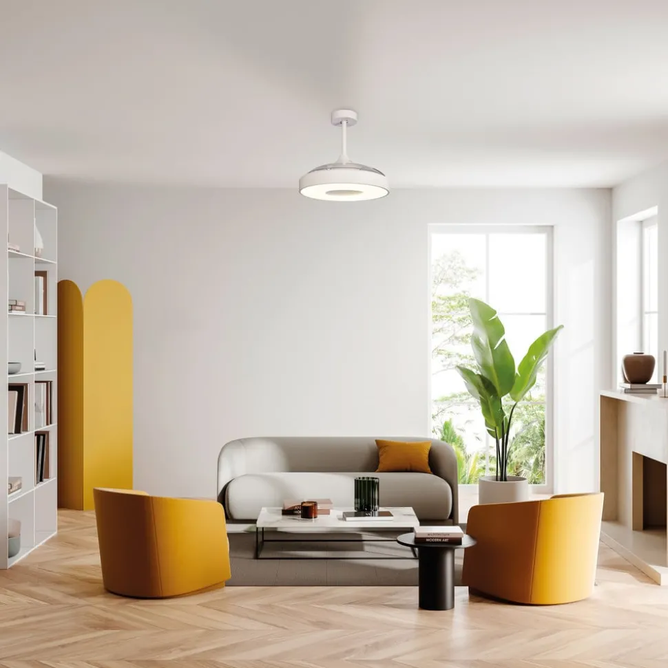 De LED plafondventilator Coin combineert een verfrissende bries met moderne algemene verlichting. De drie vleugels van transparant kunststof zijn alleen uitgeschoven wanneer de ventilator in werking is en verdwijnen boven de ronde behuizing wanneer de ventilator is uitgeschakeld. Deze laatste bevat een krachtige LED lamp, waarvan het licht dimbaar is en waarvan de lichttemperatuur kan worden geregeld en die door een gesatineerde afdekking over een groot oppervlak naar beneden schijnt. De bediening gebeurt met de meegeleverde afstandsbediening.