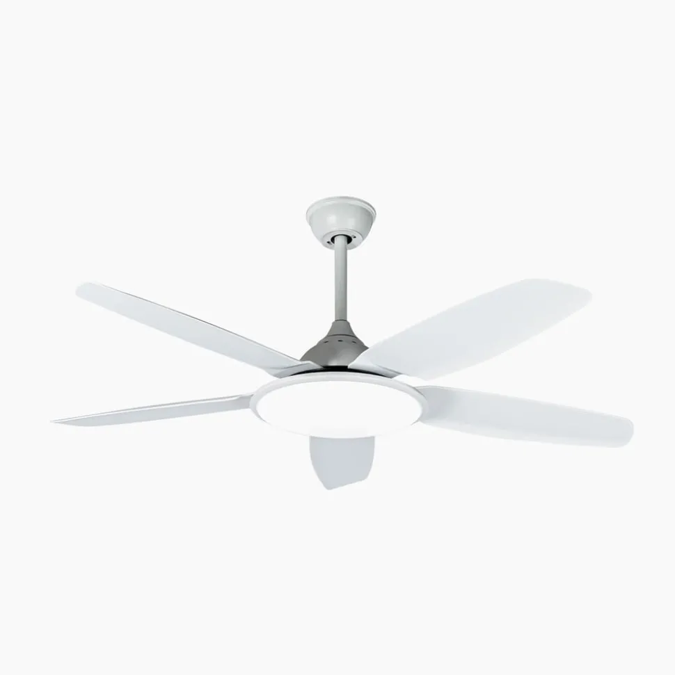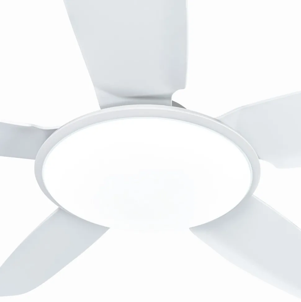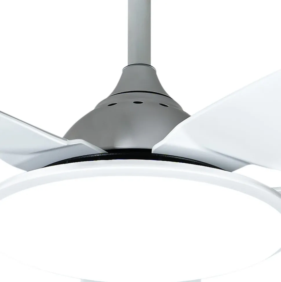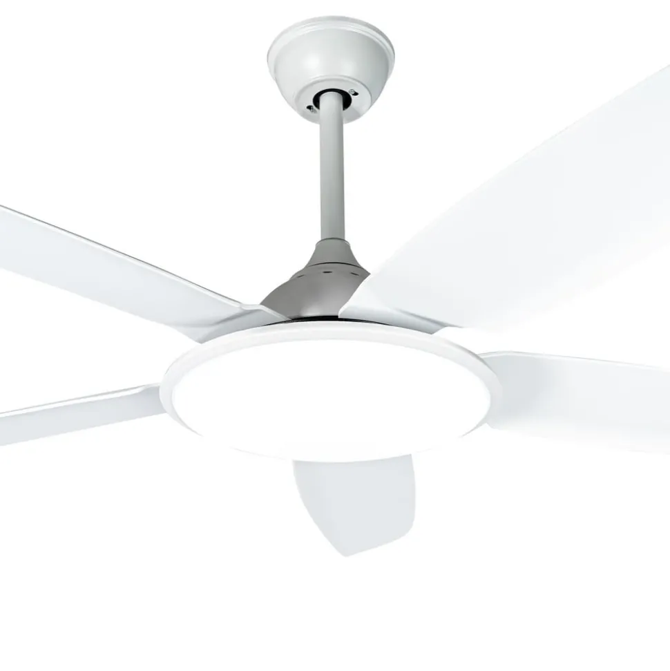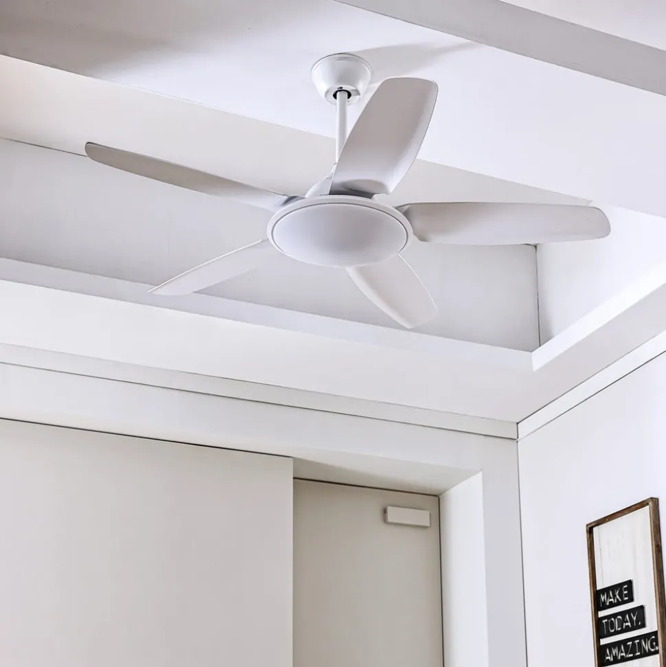 Eenvoudige Divian LED plafondventilator met regelbare lichtkleur De Divian LED plafondventilator is verkrijgbaar in een heldere, volledig witte versie. Dankzij het neutrale kleurenschema kan hij prachtig worden geïntegreerd in verschillende kleurconcepten en is hij geschikt voor kamergroottes tot 18 m². Divian heeft een stevige ijzeren behuizing en in totaal vijf kunststof bladen. Een heldere LED module is verborgen onder een ronde acryl afdekking. Functies Deze LED plafondventilator wordt geleverd met een afstandsbediening waarmee je kunt kiezen tussen vijf snelheidsniveaus en zomer- of wintermodus. De lichttemperatuur van de geïntegreerde LED-module kan ook in drie stappen worden geregeld: 3.000 K, 4.000 K. 6.500 K. De inschakelduur kan ook worden ingesteld in stappen (1 uur, 4 uur, 8 uur) met de timerfunctie.
