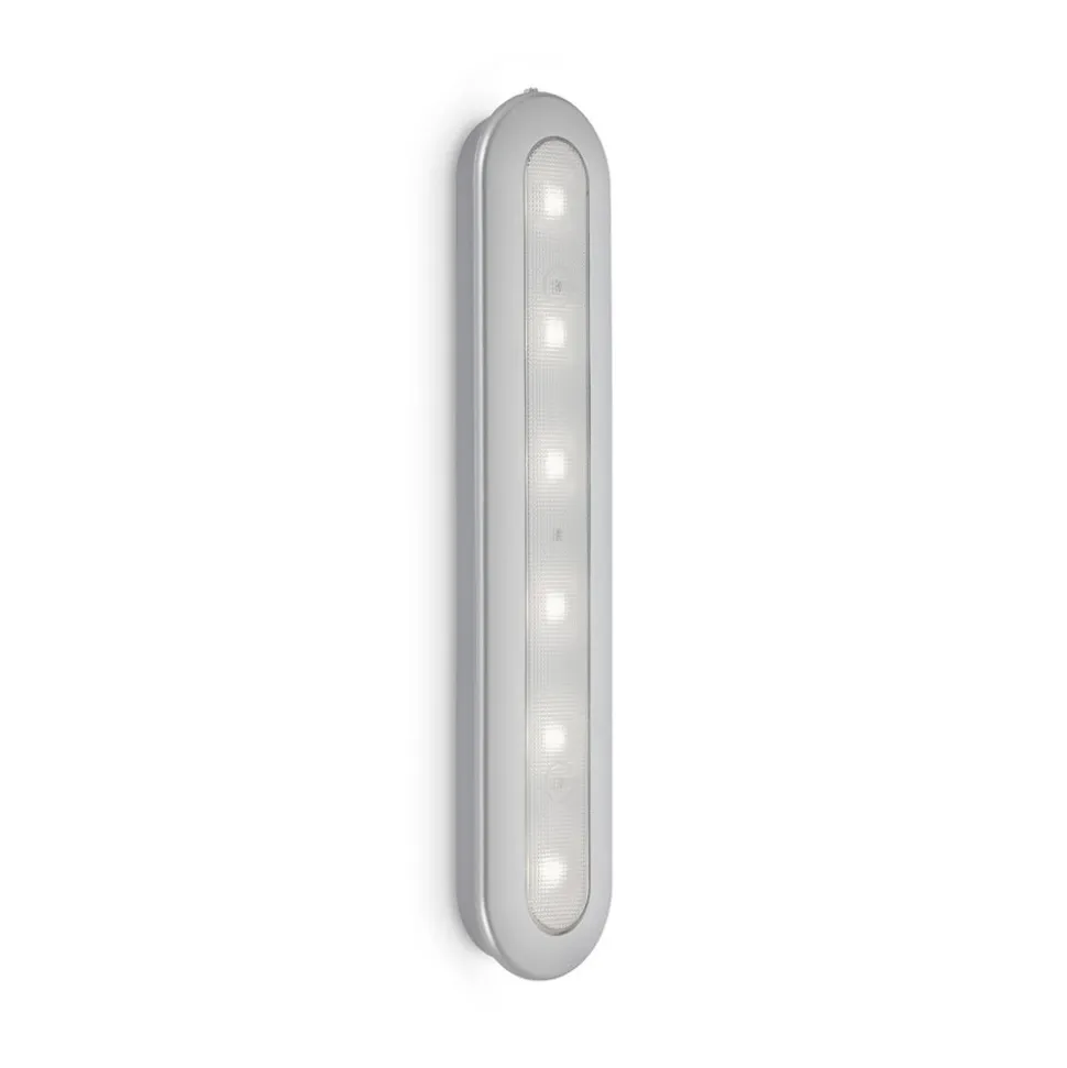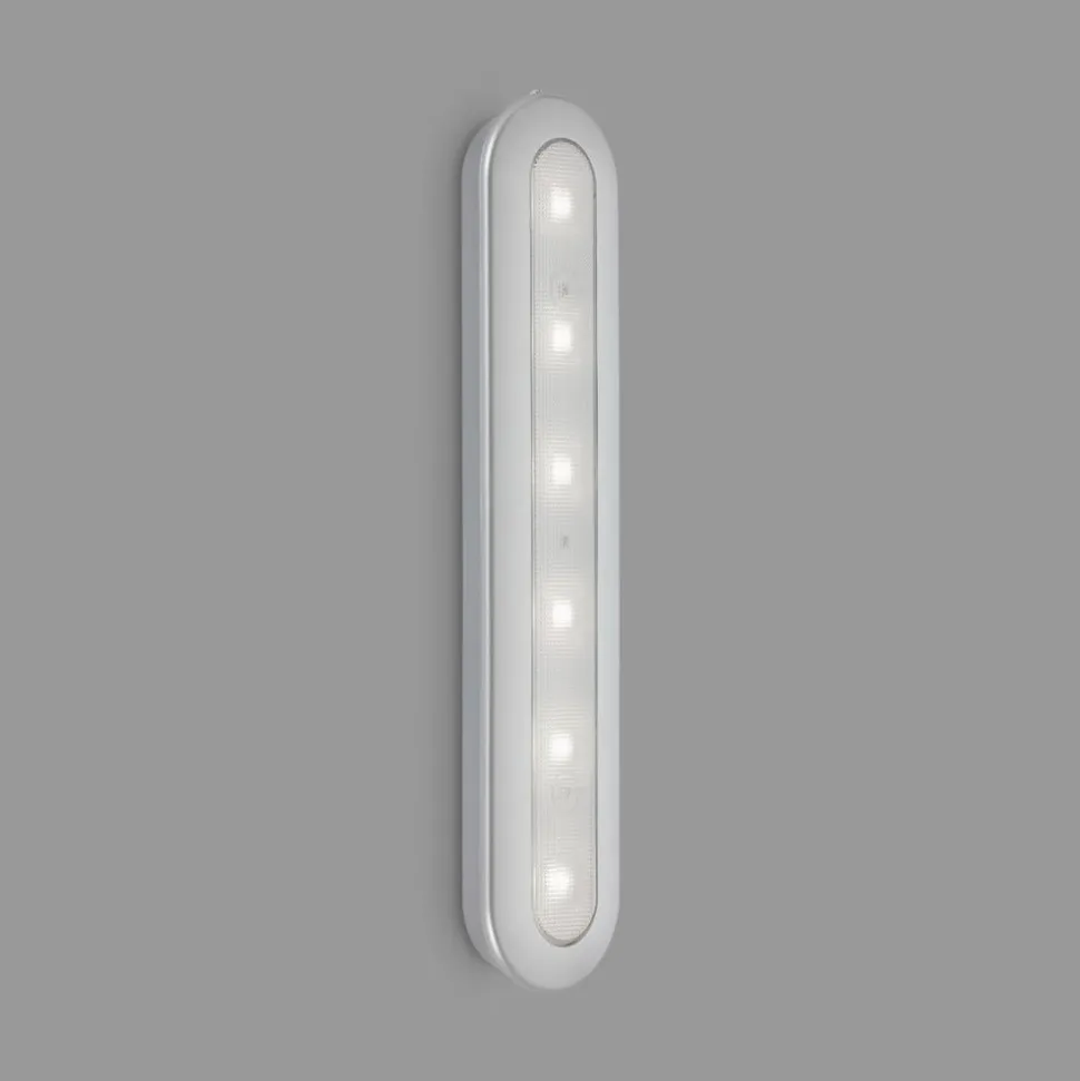 De LED Push Light Row is uitgerust met een timer waarvan de duur vrij instelbaar is. De volgende stadia kunnen worden geselecteerd – permanent aan – 1 minuut – 5 minuten – 15 minuten. De daglichtwitte LED’s worden via drukbewegingen in- en uitgeschakeld. De plastic behuizing is in een discrete zilveren kleur. De levering omvat een kleefpad en schroeven voor de montage, alsmede 6 x AA-batterijen