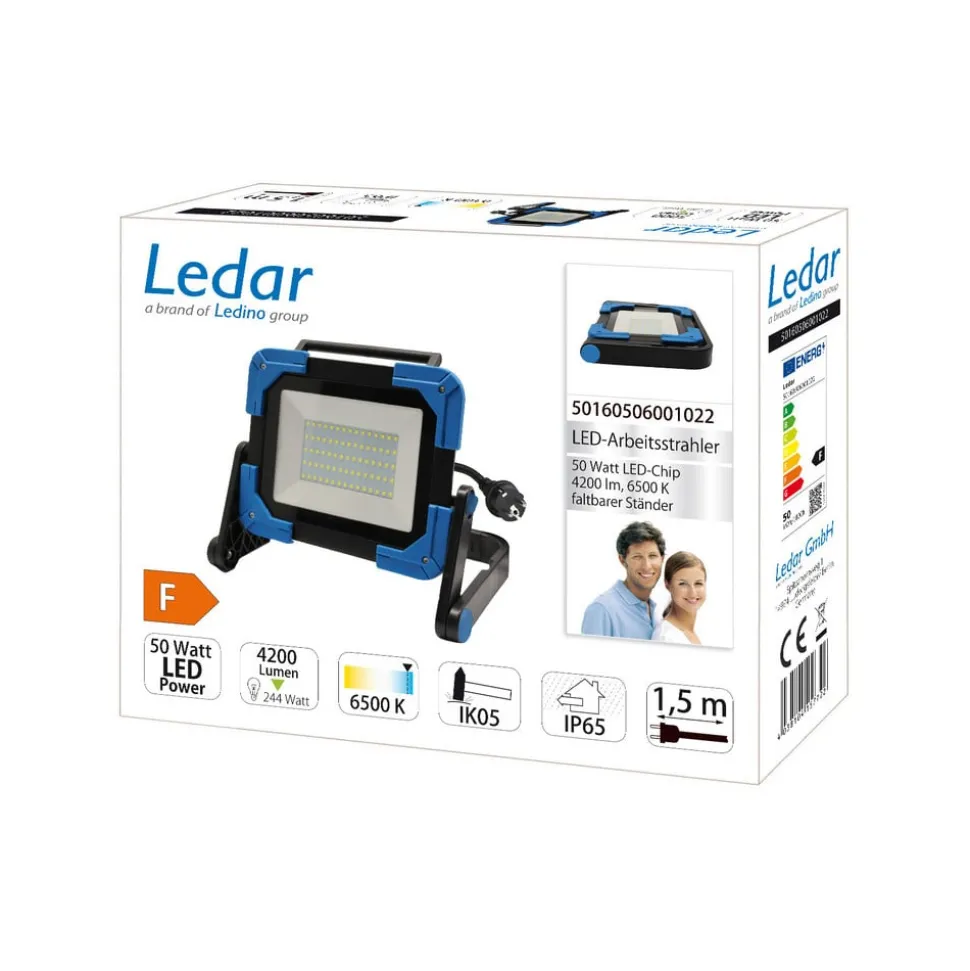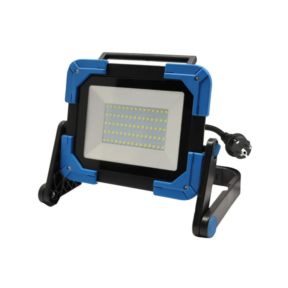 LED bouwspot Ledar van gegoten aluminium met beschermranden, 6.500 KATDe LED bouwspot Ledar is vervaardigd van zwart gegoten aluminium met blauwe beschermranden en is voorzien van een verrijdbare kunststof voet. Hij kan worden bediend met de waterdichte aan/uit-schakelaar en is voorzien van een voedingskabel van 1,5 m met stekker. – Stralingshoek 120°- Beschermingsklasse IP65- Slagvastheidsindex IK05- Diffusor van veiligheidsglas- Hoge lichtopbrengst – komt overeen met het licht van een 244 W halogeenspot