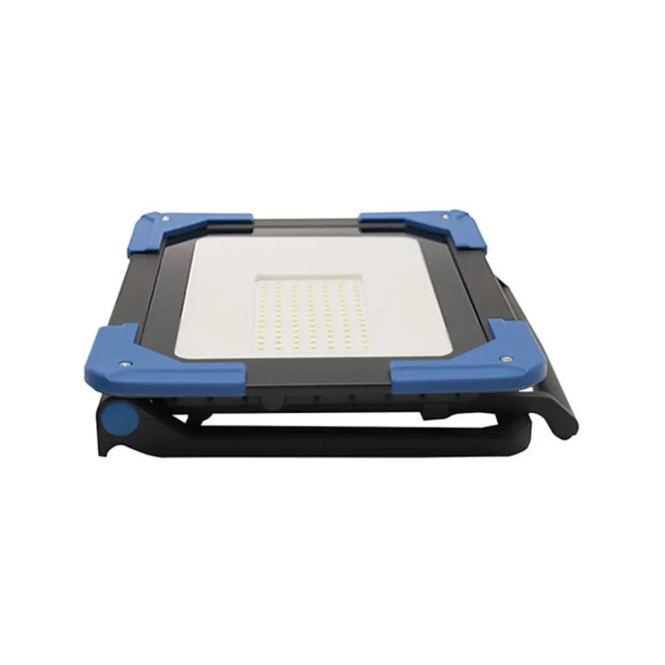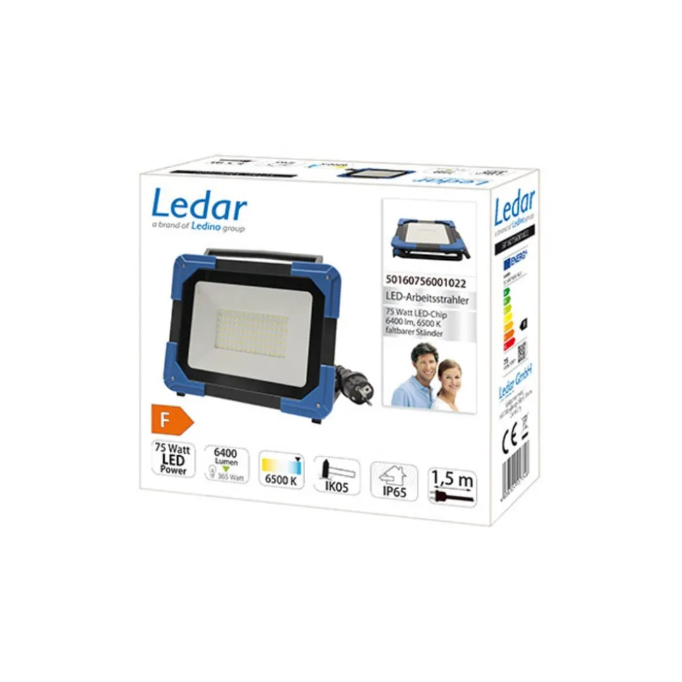 LED bouwspot Ledar van gegoten aluminium met beschermranden, 6.500 KATDe LED bouwspot Ledar is vervaardigd van zwart gegoten aluminium met blauwe beschermranden en is voorzien van een verrijdbare kunststof voet. Hij kan worden bediend met de waterdichte aan/uit-schakelaar en is voorzien van een voedingskabel van 1,5 m met stekker. – Stralingshoek 120°- Beschermingsklasse IP65- Slagvastheidsindex IK05- Diffusor van veiligheidsglas- Hoge lichtopbrengst – komt overeen met het licht van een 244 W halogeenspot