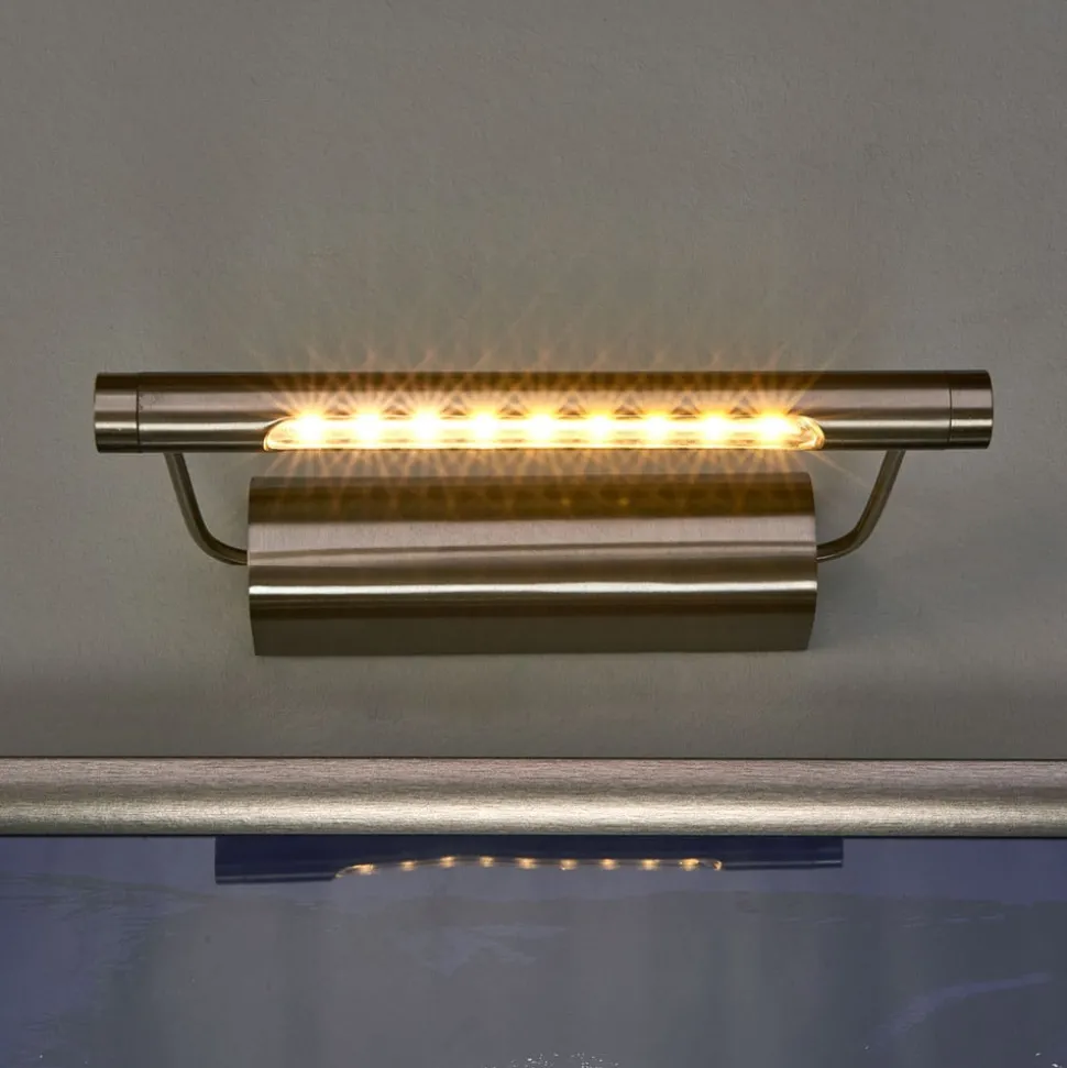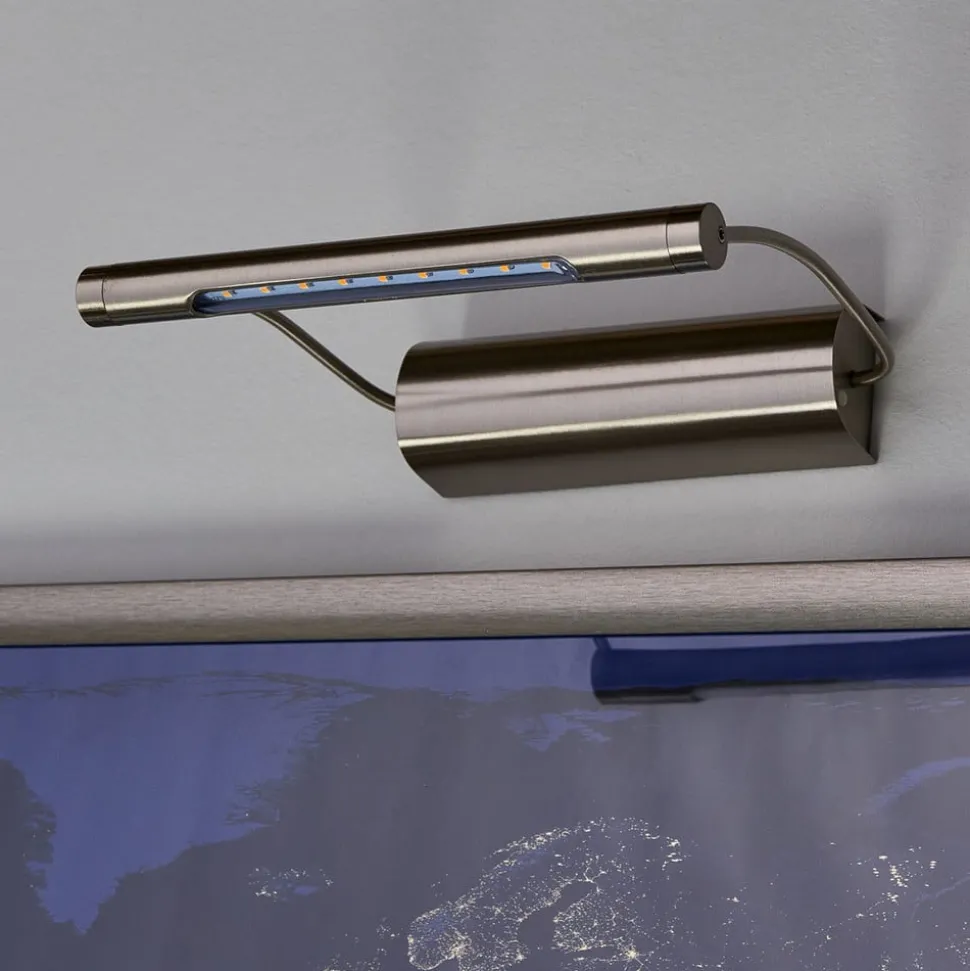 Tommy kan scoren met twee bijzondere kenmerken: ten eerste heeft de schilderij verlichting zuinige, warmwitte LEDs, en ten tweede heb je geen stroomaansluiting in de muur nodig om het mooie schilderij ermee te verlichten, omdat het de benodigde stroom krijgt van drie AA-batterijen (niet in levering inbegrepen). De behuizing is gemaakt van geborsteld roestvrij staal en is beschikbaar is een elegant en sierlijk lichtobject in elk opzicht. Aan de zijkant heeft de lamp een aan- en uitschakelaar. De zijbalken van de armatuur zijn vast en kunnen niet worden gekanteld of versteld.