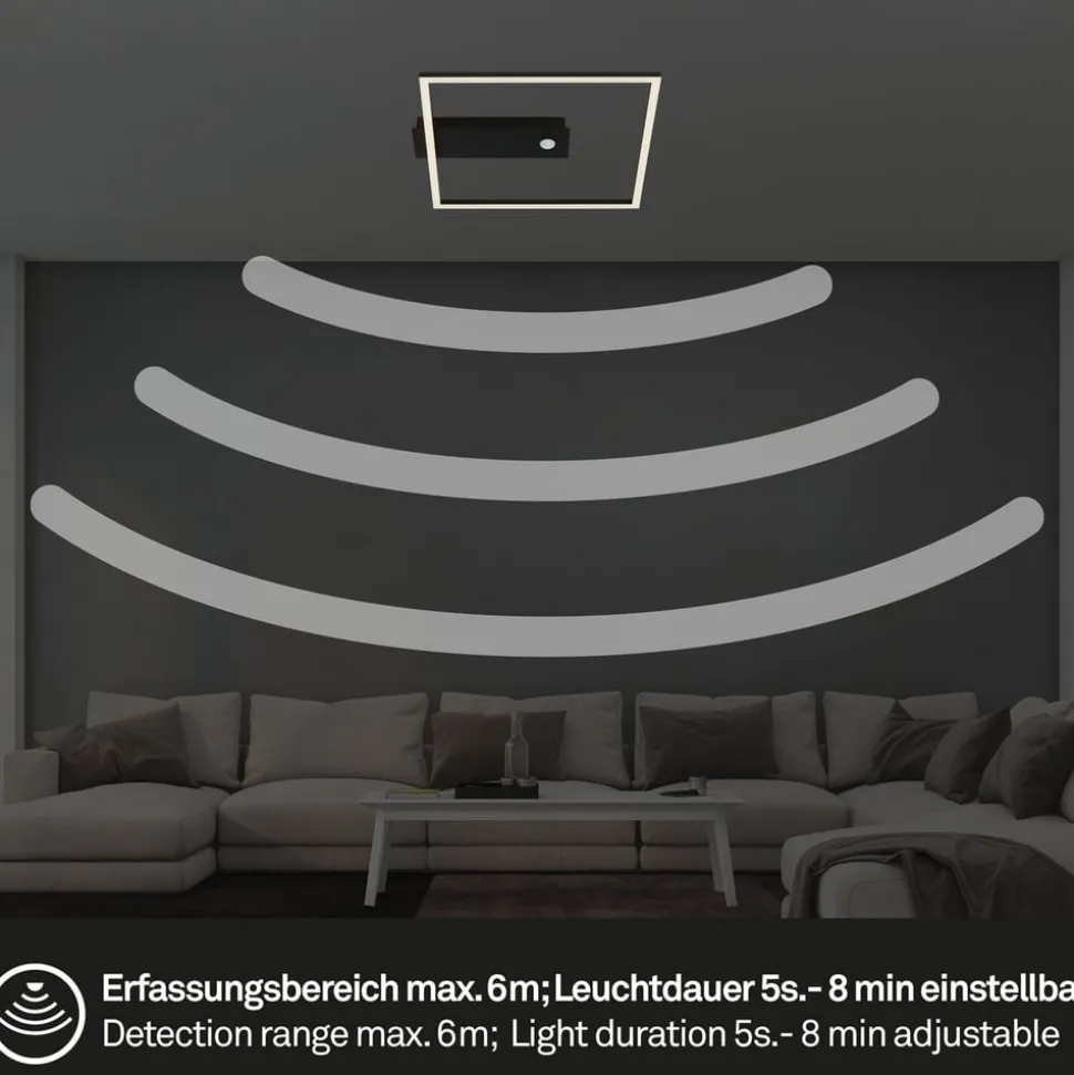 LED plafondlamp Nici in modern design met sensorbedieningDe metalen plafondlamp Nici is een praktische lichtbron voor moderne woonkamers en lounges. Onder de rechthoekige kap bevindt zich een groot, vierkant frame, waarvan de onderkant de warmwitte LED’s herbergt achter een gesatineerde kunststof afdekking. Ze worden automatisch ingeschakeld via de in de kap ingebouwde daglicht- en bewegingssensor, die vóór installatie naar wens kan worden geconfigureerd.Technische gegevens sensor:- Detectiehoek 120°- Bereik max. 6 m (instelbaar)- Schemeringsdrempel instelbaar van 10 tot 2.000 lx- Volgtijd van het licht bij bewegingsdetectie instelbaar van 5 s tot 8 min