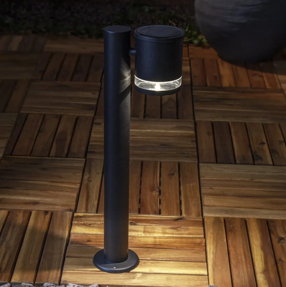 LED sokkellamp Vienna op zonne-energie in zwart – spot naar beneden De zwarte LED sokkellamp Vienna is ideaal voor oriëntatieverlichting langs voetpaden. De cilindrische behuizing is gemaakt van roestvrij staal en heeft een aluminium kop. Hierin zit een warmwitte LED waarvan het licht naar beneden wordt verspreid. Vienna is volledig autonoom – dankzij de oplaadbare batterij en de zonnemodule is er geen stroomaansluiting nodig en dankzij de schemersensor wordt het licht automatisch ingeschakeld.
