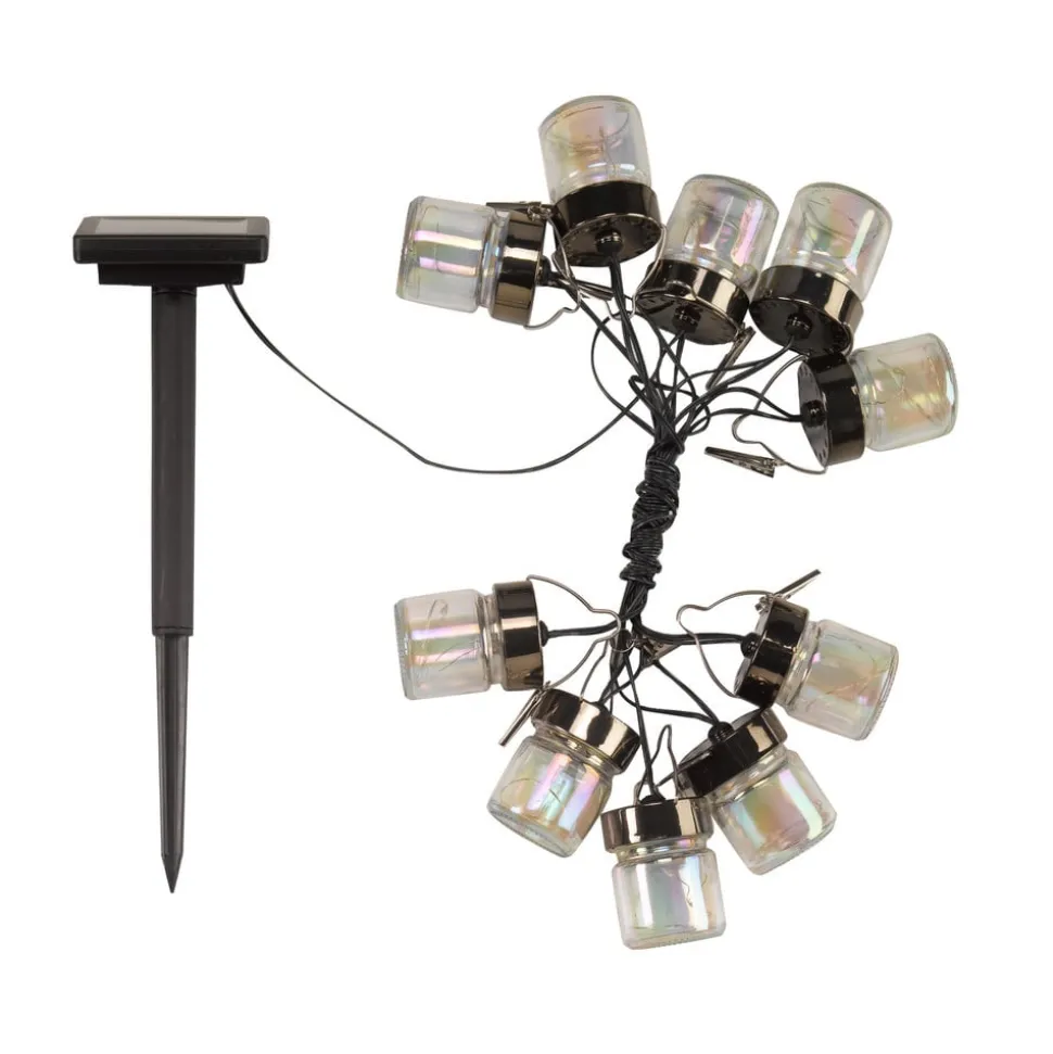 In totaal 10 kleine jampotjes van iriserend glas met nikkel en ingebouwde leds zorgen bij de LED lichtketting op zonne-energie Firefly Opal voor een bijzonder origineel design en een schitterende verlichtingssfeer. De lichtketting is aan het uiteinde voorzien van een extern zonnepaneel, zodat deze overdag de geïntegreerde accu oplaadt met zonne-energie. ’s Avonds zorgt de ingebouwde schemersensor ervoor dat het licht automatisch wordt ingeschakeld. Ideaal om struiken, bomen of overdekte terrassen sfeervol te verlichten.