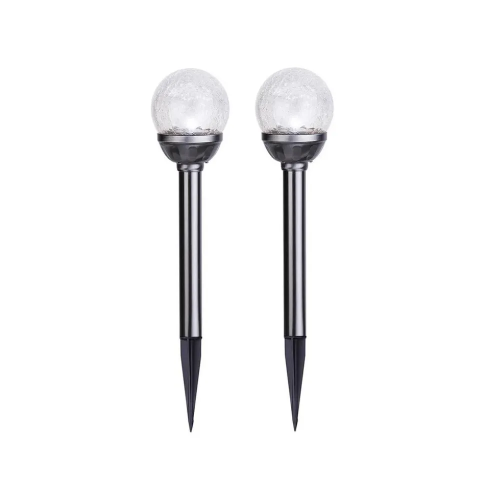 Dit mooie duo brengt ’s avonds een sfeervolle ambiance in de tuin. Elk van deze LED-zonnelampjes bestaat uit een glazen bol in gebroken glas-look met een intern zonnepaneel en een grondspies. Overdag laadt het zonnepaneel de batterij op, zodat deze ’s nachts de LED van energie voorziet. Uitgerust met schemeringssensor.