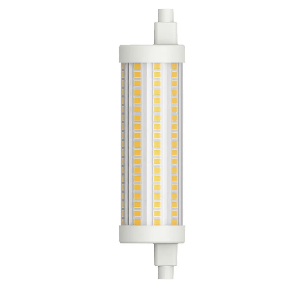 R7s 117,6 mm LED staaflamp 12 W, dimbaar, lichtkleur warm wit Deze R7s LED lamp vervangt halogeenstaaflampen van 100 W in plafondarmaturen en andere armaturen en bespaart zo veel energie. De lamp is dimbaar en heeft een warmwitte lichtkleur met 2.700 K, die overeenkomt met de lichtkleur van halogeenlampen. Technische gegevens/eigenschappen: – Vergelijkende waarde 100 W – Hoge schakelbestendigheid met 100.000 schakelcycli – Dimbaar