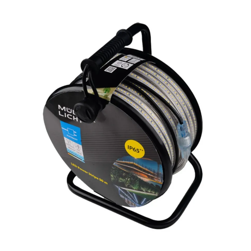 LED strip voor buiten met IP65 en stekker Deze LED strip, die wordt geleverd op een kabelhaspel met voedingskabel en stekker, is de ultieme verlichtingsoplossing voor professioneel buitengebruik. De extra heldere en krachtige LED Power Strip van Müller-Licht biedt de perfecte combinatie van robuustheid, flexibiliteit en gebruiksvriendelijkheid. Op bouwplaatsen, in magazijnen, feestkelders of voor de snelle verlichting van sportfaciliteiten, evenementen en buiten – deze LED strip is altijd de juiste keuze. Met een indrukwekkende helderheid en daglicht zorgt de LED Power Strip voor een gelijkmatige verlichting. Dankzij de praktische kabelhaspel en de eenvoudige plug-and-play oplossing is hij direct klaar voor gebruik – uitrollen, verlichten, oprollen, klaar! De LED strip is niet alleen extreem robuust en flexibel, maar ook speciaal ontworpen voor gebruik binnen en buiten. Met beschermingsklasse IP65 en slagvastheid van IK08 doorstaat hij moeiteloos de meest veeleisende omstandigheden.
