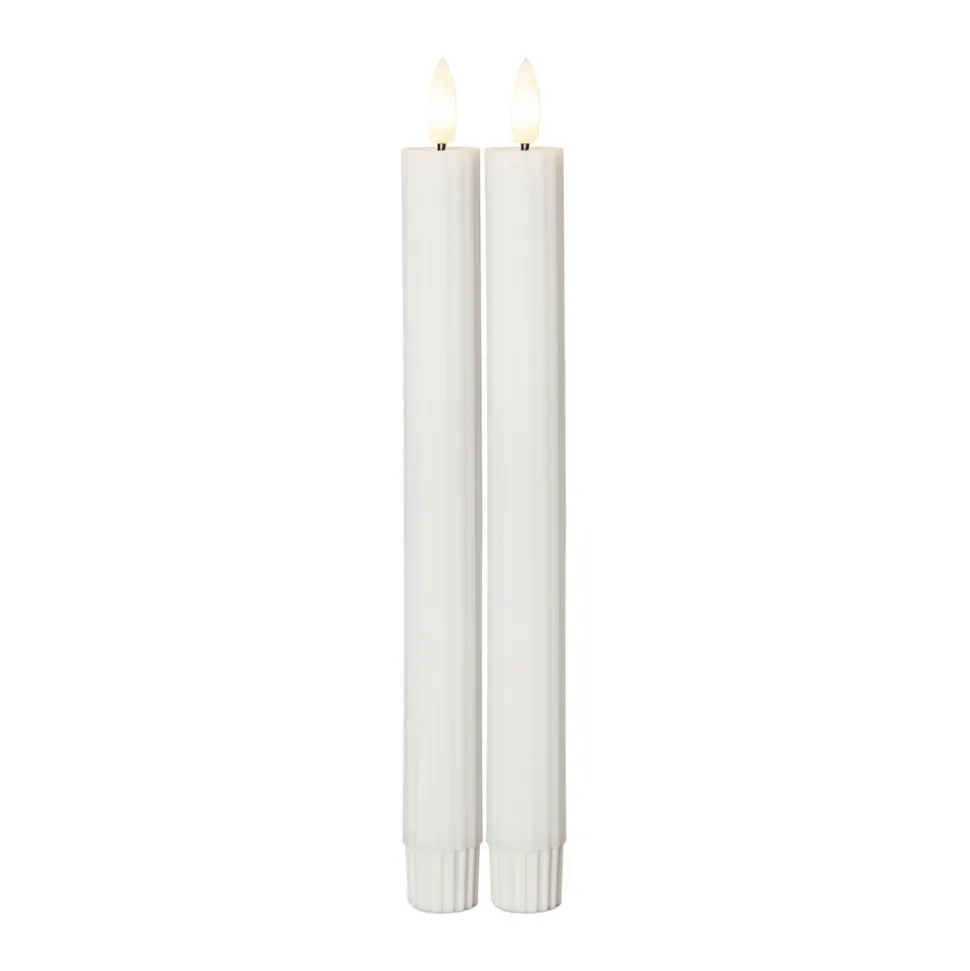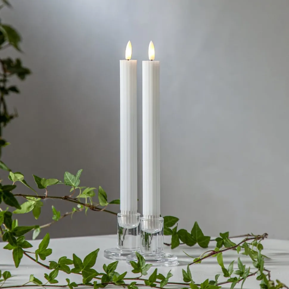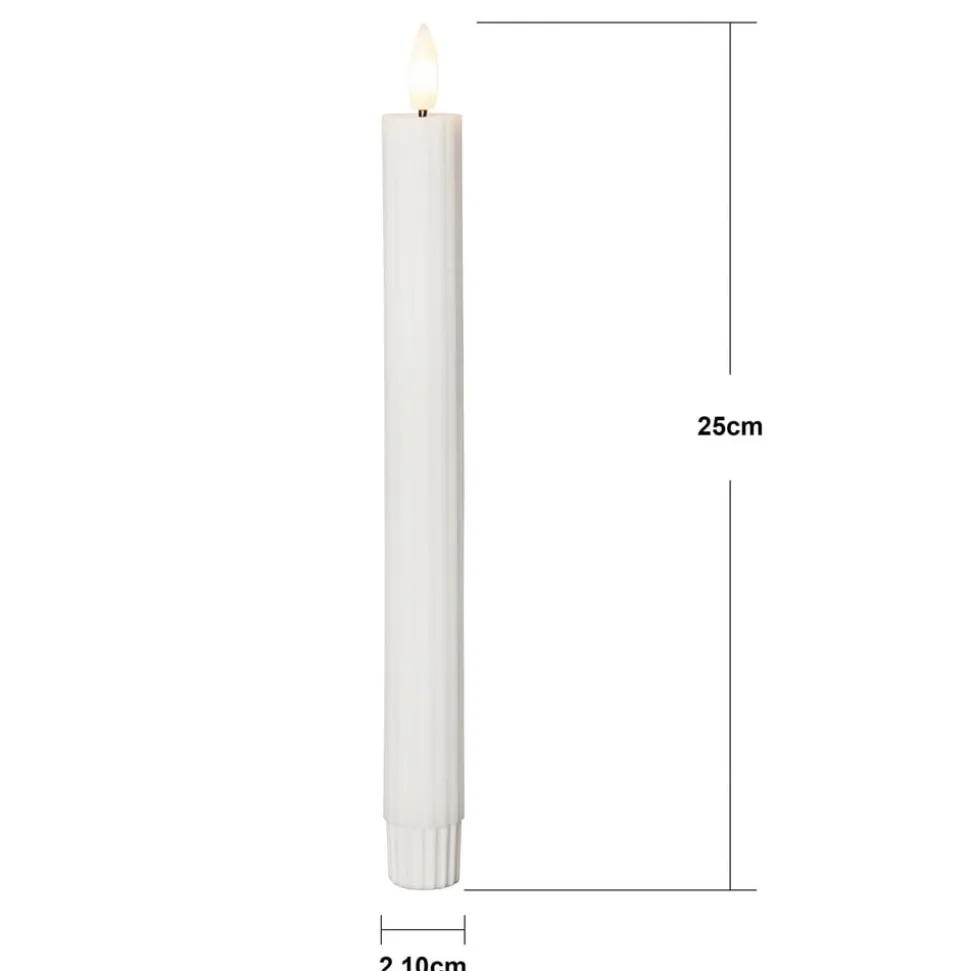 Set van 2 – Flamme Stripe LED decoratieve kaars op batterijen voor binnen – met timerfunctie De Flamme Stripe LED kaars is een praktische keuze voor het decoreren van je huis met Kerstmis. De decoratieve kaars is gemaakt van echte was in een slanke, geribbelde vorm. Hij kan overal worden geplaatst dankzij de werking op batterijen (2 x AAA – exclusief). Hij kan automatisch worden ingeschakeld met een timer (6 uur aan, 18 uur uit). Twee kaarsen inbegrepen.