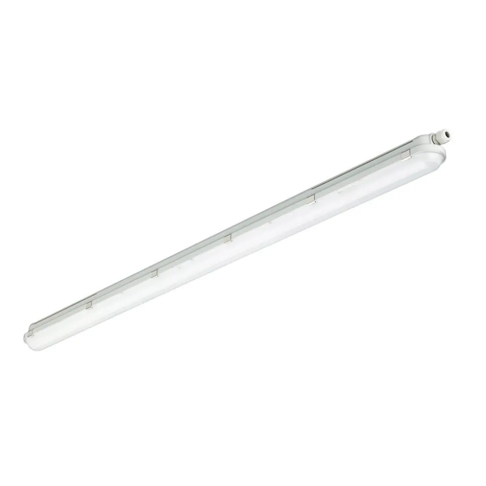 Vochtbestendige lamp WT120C, Dali dimbaar, lengte 151,5 cm WTC120C is een functioneel diffusorarmatuur uit de Philips CoreLine Waterproof G2 LSC serie, die een energiebesparend alternatief is voor conventionele armaturen met TL-buizen. Dankzij de spuitwaterdichte en slagvaste constructie van polycarbonaat kan het worden gebruikt in een groot aantal omgevingen, zoals wasruimten, kelders, opslagruimten, parkeergarages en werkplaatsen. De levering omvat beugels voor opbouwmontage en haken voor pendelmontage – Inclusief voorschakelapparatuur (PSD, Dali dimbaar) – Stralingshoek: 105° – Omgevingstemperatuur tijdens gebruik: – 20 °C tot + 35 °C – Beschermingsgraad: IP65 – Slagvastheid: IK08 – 5-pins snelconnector – Schroefbare kabelinvoer