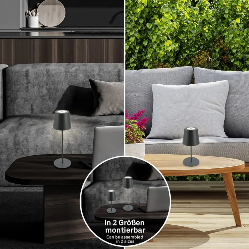 Ronde LED tafellamp voor buiten met oplaadbare batterij en touchdimmer Deze metalen LED tafellamp met ronde voet en tijdloze kap is een veelzijdige extra lichtbron voor binnen en buiten. Het licht van de geïntegreerde LED-lichtbron wordt naar beneden gericht zodat het omliggende tafeloppervlak wordt verlicht zonder te verblinden. Het wordt bediend via het aanraakbedieningsoppervlak op de kop. Dankzij de oplaadbare batterij kan de LED tafellamp mobiel worden gebruikt – Beschermingsgraad: IP44 – Dimniveaus: 100% / 50% / 15% – Inclusief USB-oplaadkabel voor opladen in een droge ruimte binnenshuis – Verlichtingsduur: 15 uur bij 15% lichtopbrengst – Inclusief twee framestokken voor montage in verschillende maten