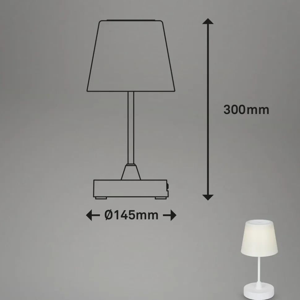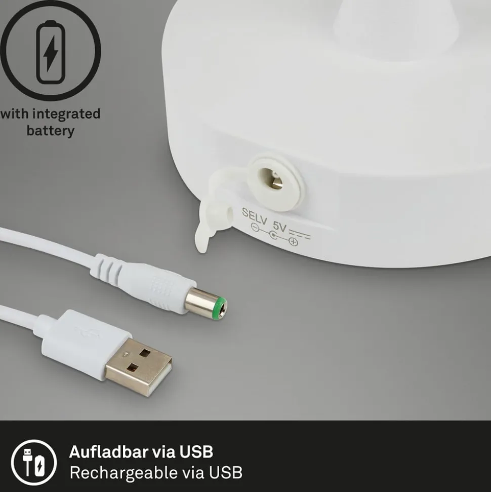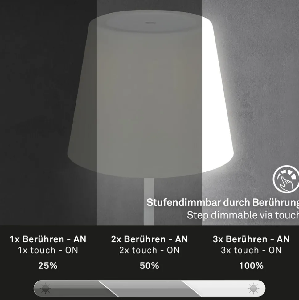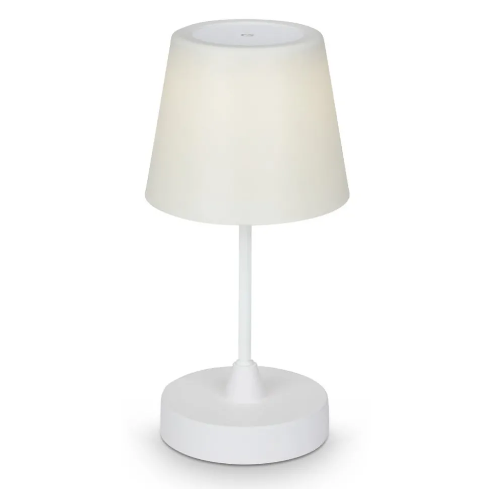 Kleine Campi LED tafellamp met oplaadbare batterij voor buiten De Campi LED tafellamp, die beschermd is tegen spatwater (IP44), is een sfeervolle, universeel witte lichtbron op het terras, tijdens een tuinfeest of op reis. De lamp is uitgerust met een oplaadbare batterij en wordt geleverd met een USB-kabel voor opladen. Met het aanraakbedieningsvlak bovenop de witte kap kun je schakelen en dimmen in drie helderheidsniveaus (100 %, 50 %, 25 %).