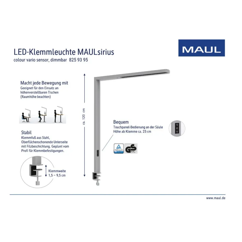 Ideaal voor in hoogte verstelbare bureaus: MAULsirius LED klemlamp met bewegings- en daglichtsensor – instelbare lichtkleur en helderheid De MAULsirius LED klemlamp kan eenvoudig aan het bureaublad worden bevestigd. Hij straalt zowel direct (30%) als indirect licht (70%) uit. De ideale verlichtingsoplossing voor in hoogte verstelbare bureaus. Het klembereik is 1,5 cm tot 9,5 cm. Een bewegingsmelder en een daglichtsensor zijn geïntegreerd in MAULsirius, d.w.z. het licht wordt alleen ingeschakeld wanneer het nodig is. De daglichtsensor regelt de lichtoutput en straalt alleen zoveel licht uit als de natuurlijke lichtomstandigheden in de ruimte vereisen. Na 30 minuten zonder bewegingsdetectie wordt het licht eerst dimbaar en na nog eens 30 minuten wordt de verlichting automatisch uitgeschakeld. Het licht wordt geregeld via het bedieningspaneel, dat zich ca. 25 cm boven de tafelklem bevindt – traploos dimbaar – traploos instelbare lichttemperatuur – met diffuser voor weinig schaduw – lichtverdeling: indirect 70% en direct 30% – onderste verlichtingssterkte: 2020 lux / 110 cm, 3360 lux / 85 cm