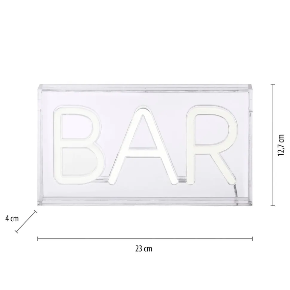 Feeststemming thuis: met de LED tafellamp Neon Bar, USB De LED tafellamp Neon Bar van kunststof presenteert zich in een rechthoekige vorm met een heldere behuizing. Binnenin zijn de geïnstalleerde LED’s te vinden als letters en produceren ze wit licht. Een USB-kabel met USB-A stekker (zonder voeding) en schakelaar (aan/uit) is vast geïnstalleerd.