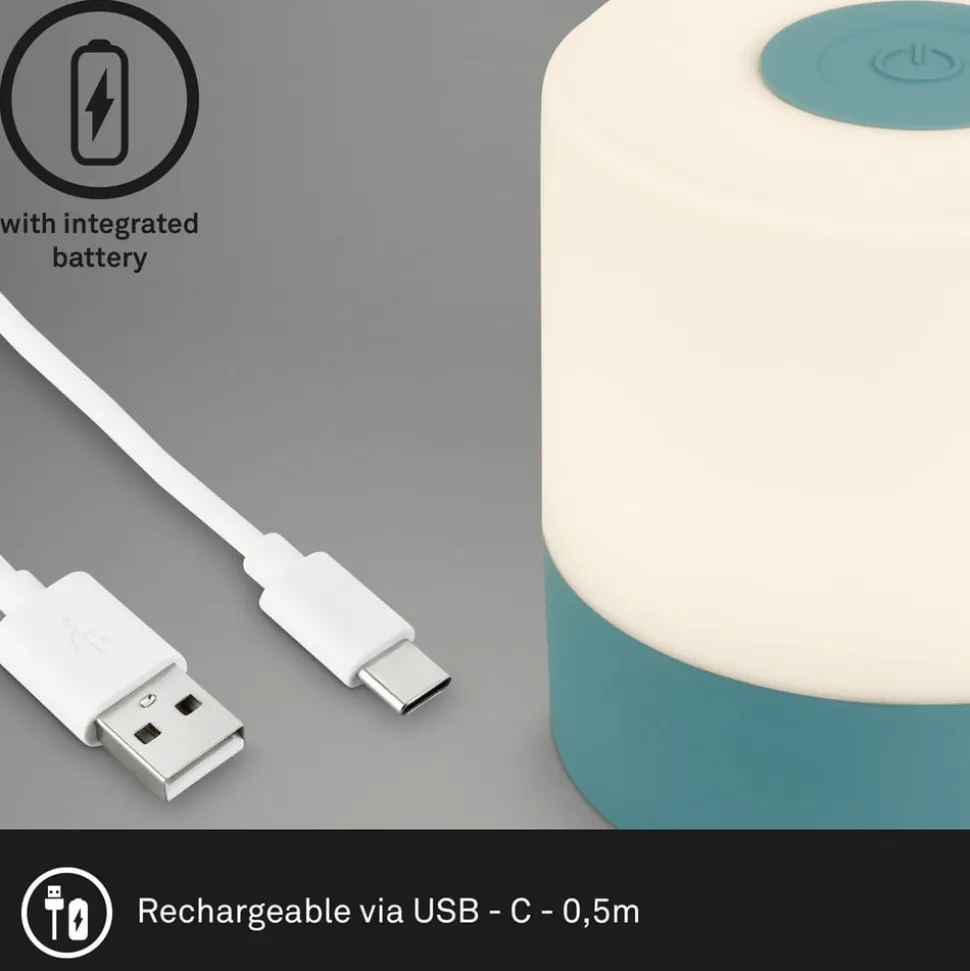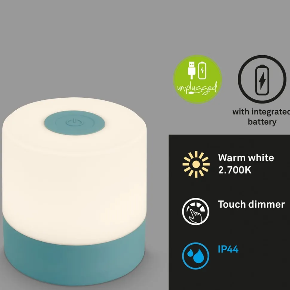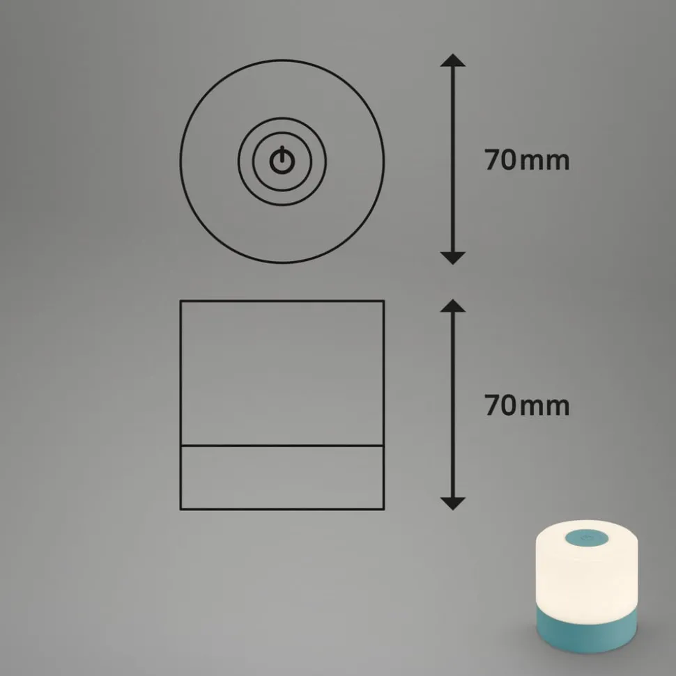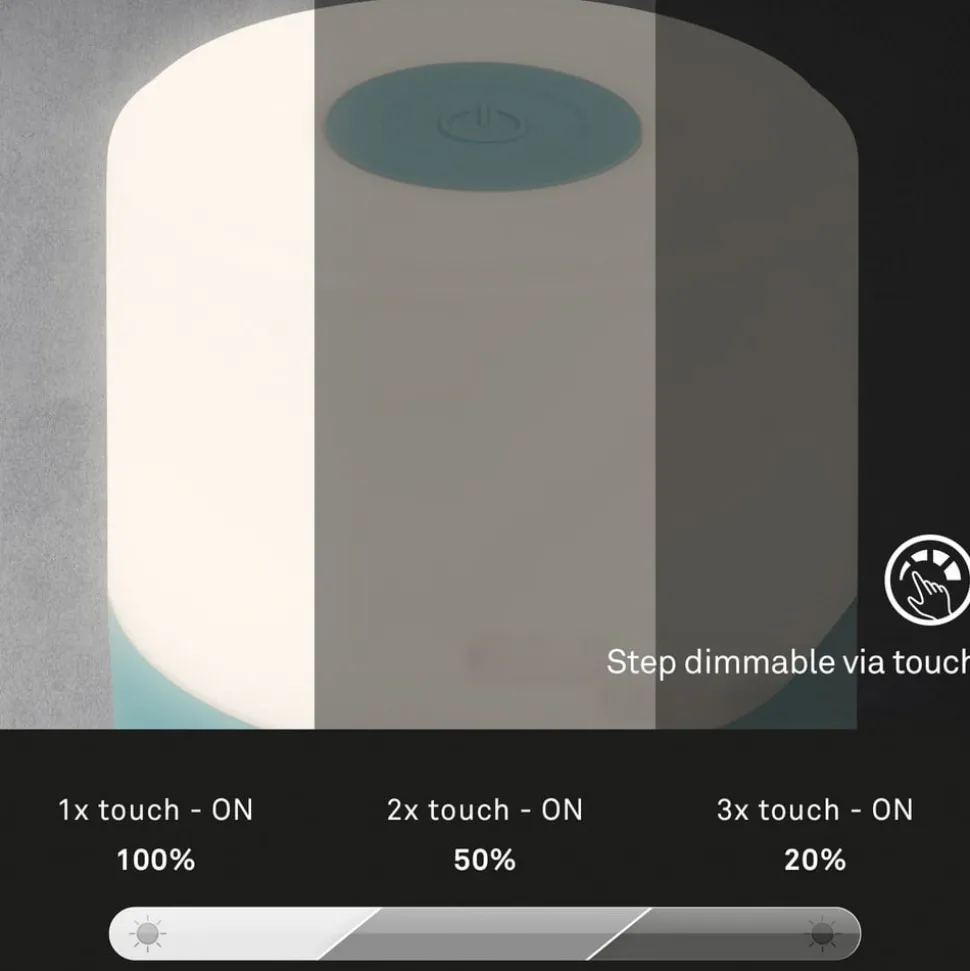 Compacte LED tafellamp 74610 met oplaadbare batterij en touchdimmer, warm wit (2.700 K)De kleine LED tafellamp in cilindervorm is uitgerust met een oplaadbare batterij en kan daardoor flexibel overal binnenshuis worden geplaatst en dankzij beschermingsklasse IP44 ook op het terras of in de tuin als sfeervolle lichtbron zonder storende kabel. De batterij kan worden opgeladen via de meegeleverde USB-oplaadkabel (zonder netadapter). De lamp wordt in- en uitgeschakeld via de schakelaar die in de voet van de lamp is geïntegreerd. De lamp kan op drie helderheidsniveaus worden geschakeld (100 %, 50 % of 20 % helderheid) via de aanraakschakelaar bovenop de lamp door de sensor herhaaldelijk aan te raken.