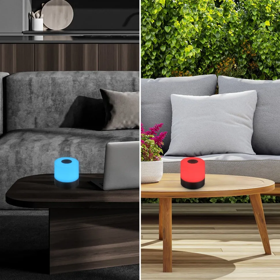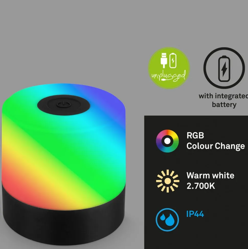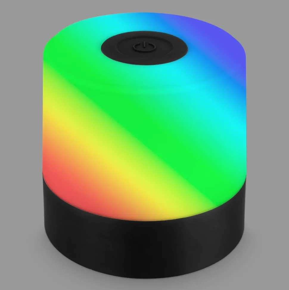 LED tafellamp 74620 met oplaadbare batterij, RGB-kleurwisseling en warmwit lichtDeze kleine LED tafellamp met geïntegreerde oplaadbare batterij geeft naar keuze warmwit of gekleurd licht, zowel in kleurwisseling als in een constante kleur. De lamp van kunststof wordt in- en uitgeschakeld via de in de voet geïntegreerde schakelaar. Door het aanraken van de sensorschakelaar bovenop de lamp kan met één aanraking warm wit licht worden ingesteld, herhaalde aanrakingen schakelen de kleurwisseling in, de derde aanraking stopt de kleurwisseling in de gewenste kleur en de vierde aanraking schakelt de lamp uit.Bij de levering is een USB-oplaadkabel zonder netstekker of een netadapter voor het opladen van de batterij inbegrepen.