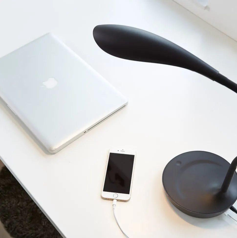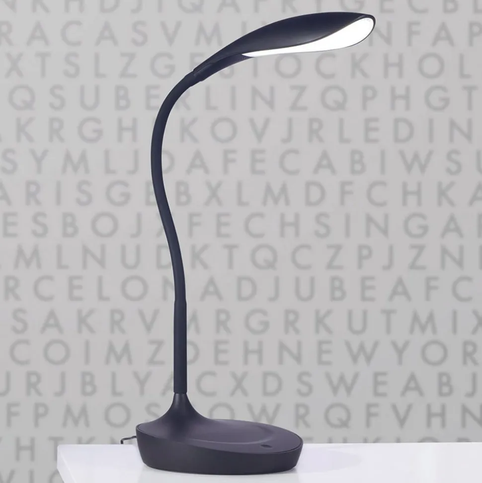 Praktische LED tafellamp Swan met dimmer Swan is een Modieuze, functionele lichtbron voor op het bureau. Verschillende praktische verstelmogelijkheden gaan hand in hand met een elegant gebogen ontwerp en monochroom understatement. De voet gaat naadloos over in een flexibele arm. Hierdoor kan de kap worden uitgelijnd met de LED lichtbronnen. Dankzij de in de voet geïntegreerde dimmer en een USB-uitgang, waarmee bijvoorbeeld een smartphone kan worden opgeladen, wordt Swan al snel onmisbaar op het bureau.