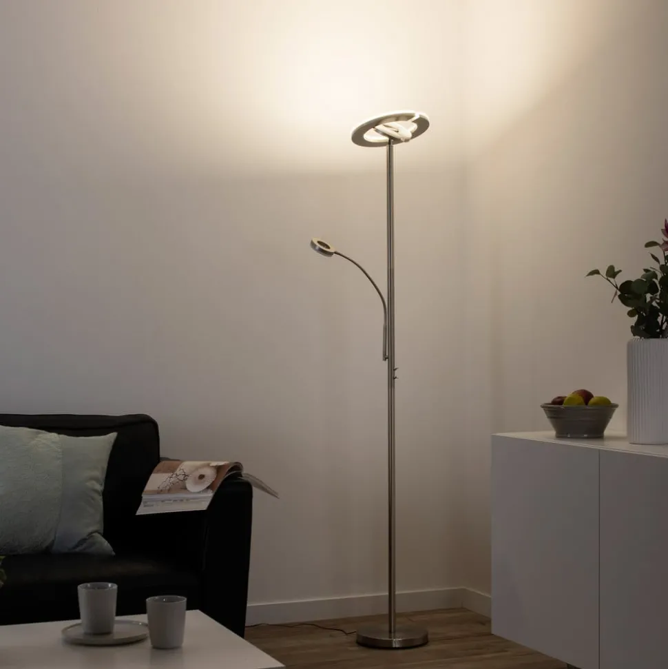 Moderne Rocco LED uplighter met leeslampje – te bedienen met afstandsbediening, app of spraakassistent De moderne Rocco LED vloerlamp heeft drie lichtbronnen, die met zijn metalen frame perfect geïntegreerd kunnen worden in bijna elke woonruimte. De kleine leeslamp is praktisch en kan op elk moment in de gewenste positie worden gezet met zijn flexibele arm. De twee naar boven stralende hoofdlichtbronnen zijn geïntegreerd op twee ringen op de kop, die elk in hun richting kunnen worden versteld en indirect licht geven via het plafond. De lichtkleur kan naar wens worden gedimd en aangepast van warmwit tot universeel wit of in kleurrijke tinten. Dit gebeurt met de meegeleverde afstandsbediening of, na WLAN-integratie, via app of spraakbesturing. Speciale kenmerken / compatibiliteit: – Bedienbaar met de meegeleverde afstandsbediening (incl. geheugenfunctie) – Bedienbaar met de meegeleverde afstandsbediening (incl.) Geheugenfunctie) – bedienbaar met de gratis Medion LIFE+ app, die via WLAN rechtstreeks communiceert met de lamp – bedienbaar via Amazon Alexa (elke generatie; Medion LIFE+ Skill) en Google Home – RGB kleurregeling (uplight) en witte lichtregeling (uplight en leeslampje) – dimbaar via afstandsbediening, app of spraakassistent – verschillende voorgeprogrammeerde verlichtingsscènes, zoals zonsondergang, feestverlichting of ontspannen