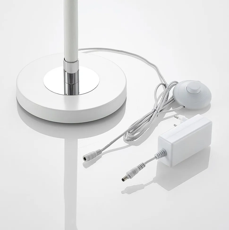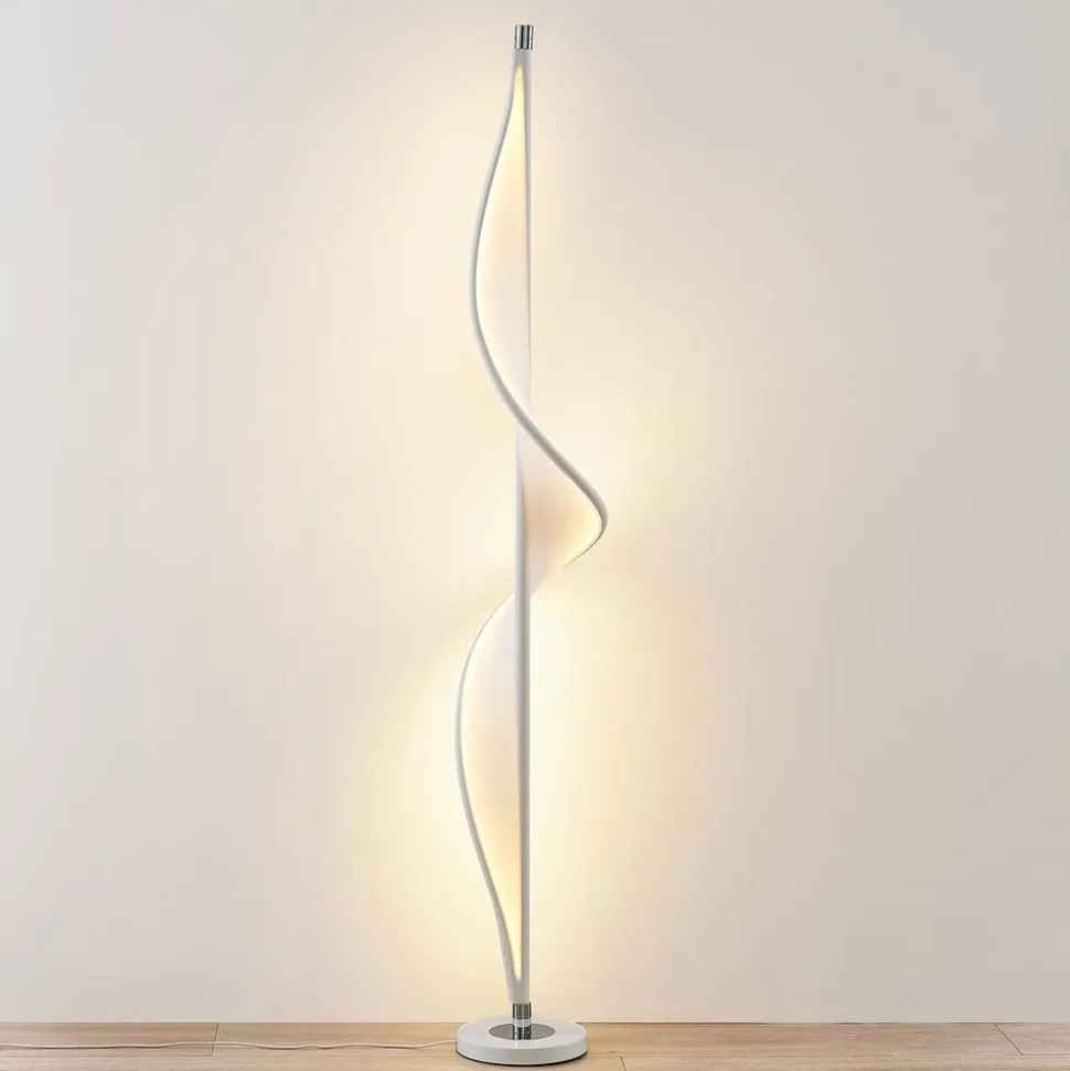 LED vloerlamp Edano met een kap van wit textiel, dimbaar in drie fasen De LED vloerlamp Edano heeft een zeer ongebruikelijk ontwerp. De witte textielen kap kronkelt als een lengte stof van boven naar beneden rond het torenhoge frame, waardoor het lijkt alsof de stof door de wind wordt rondgedraaid. De witte stof wordt verlicht door warmwitte LED’s, die de hele structuur nog effectiever maken als het licht aan is. Maar zelfs als de LED vloerlamp is uitgeschakeld, is hij uiterst decoratief dankzij zijn unieke vorm en effectieve kap, waardoor hij een designobject in de woonkamer wordt. De Edano LED vloerlamp van aluminium en witte stof past dankzij zijn ongewone ontwerp bijzonder goed in moderne interieurs. Hij wordt gemakkelijk met de voet bediend met behulp van de schakelaar die in het snoer is geïntegreerd. 3-staps dimbaar + uit: met de schakelaar kan het licht op de gebruikelijke manier worden in- en uitgeschakeld. Dankzij de 3-staps dimtechnologie met geïntegreerde uit-functie kan de lamp ook tot drie verschillende helderheidsniveaus worden gedimd door meerdere keren op de schakelaar te drukken: 100%, 50% en 10%.