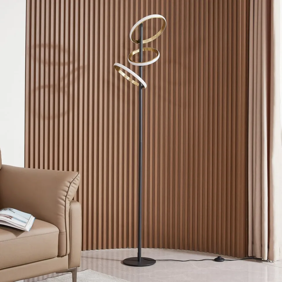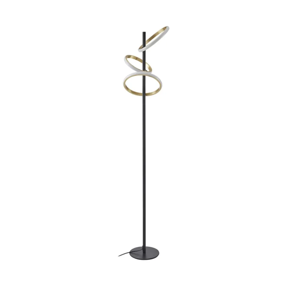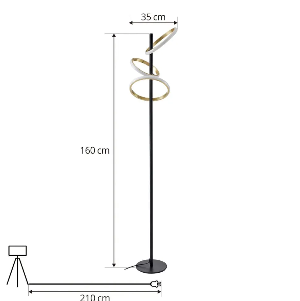 Dimbare Madu LED vloerlamp met universeel wit licht De Madu LED vloerlamp met ringvormige lichtelementen is een moderne en energiebesparende verlichtingsoplossing voor in huis. Met haar geïntegreerde LED lichtbron zorgt ze voor een aangenaam en helder licht dat rondom wordt verspreid, aangezien de module als een lichtstrook over de buitenste baan van de ringen wordt verdeeld. De meegeleverde dimmer maakt het mogelijk om de helderheid individueel aan te passen en zo een gezellige sfeer te creëren. De ringvormige elementen van de vloerlamp geven hem ook een speciale look en maken er een echte blikvanger van.