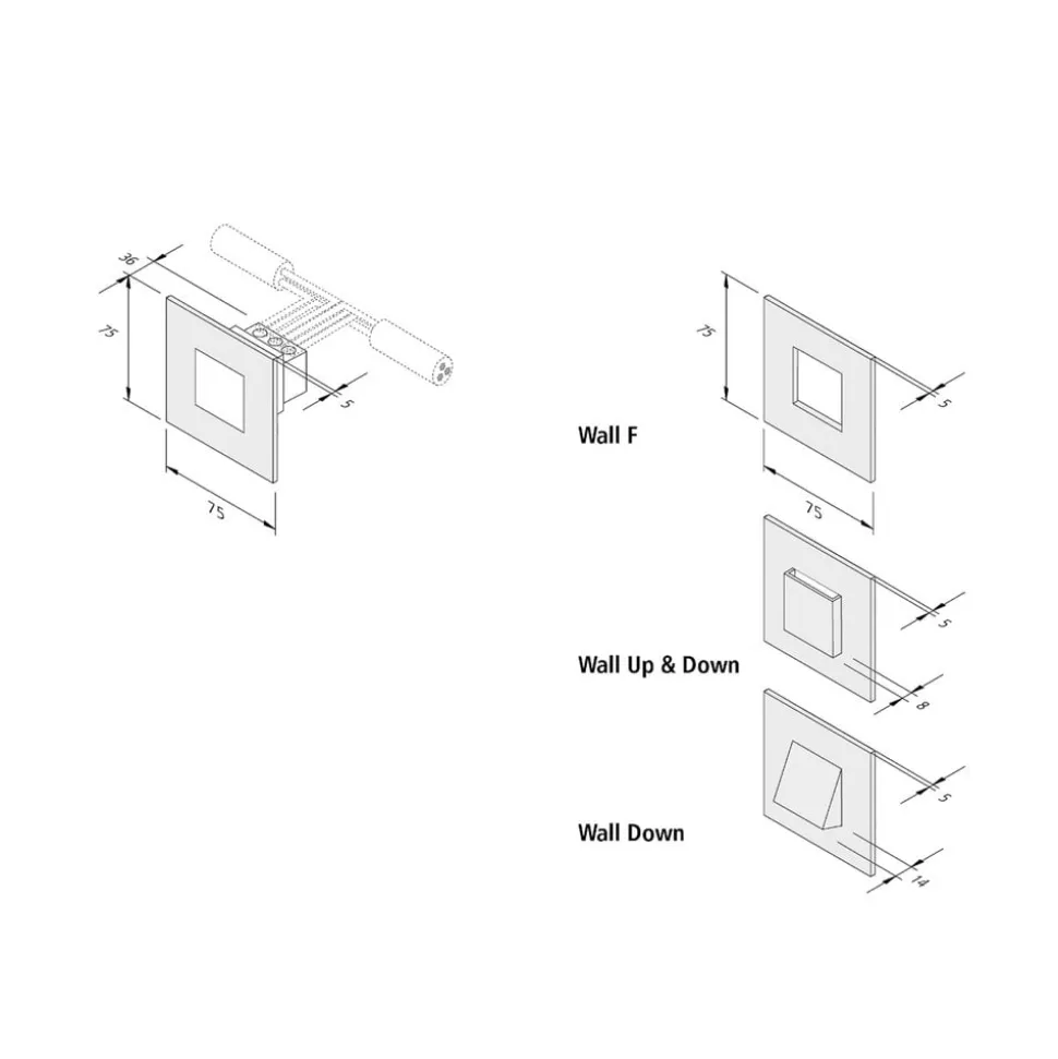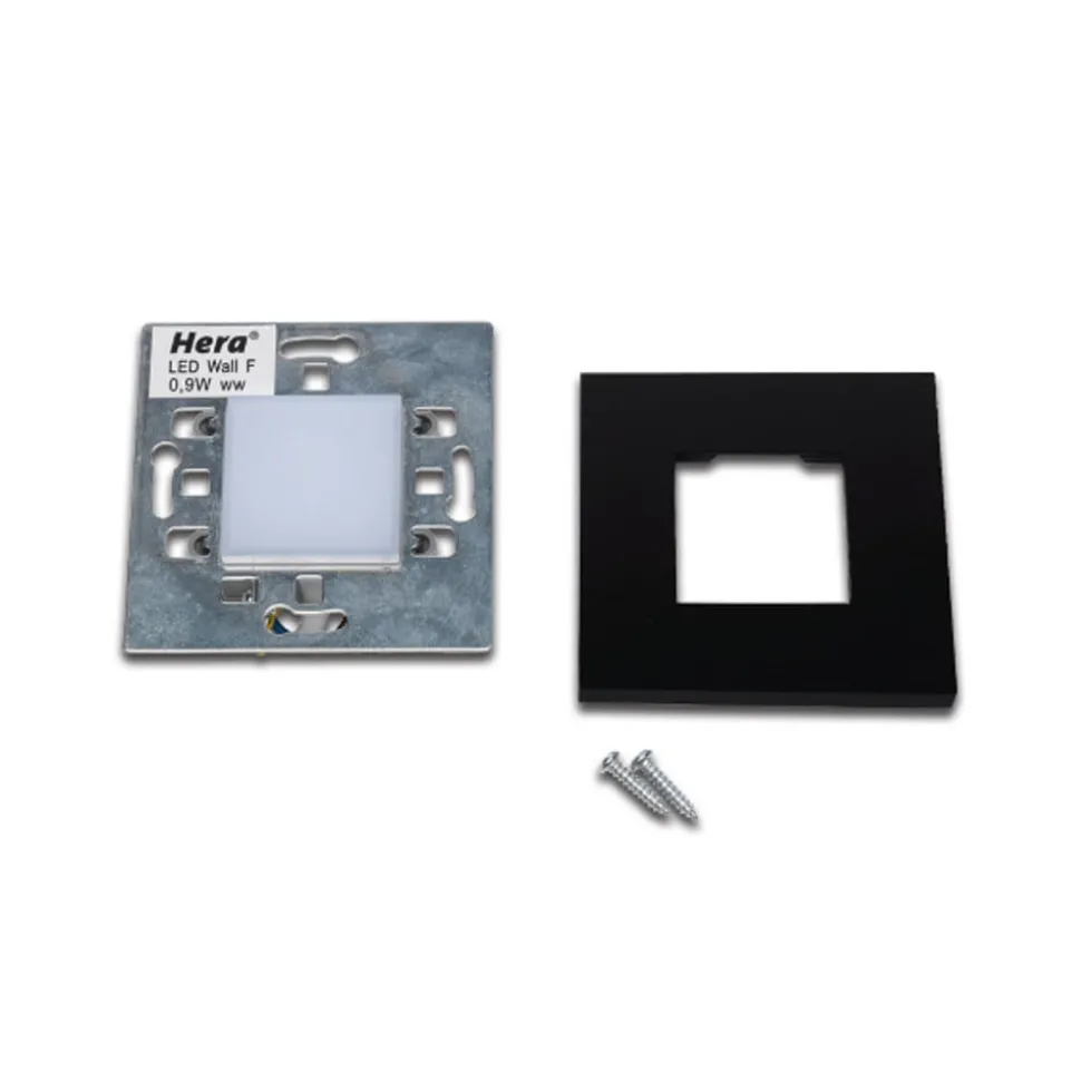 Platte, vierkante LED inbouwlamp Wall F in zwart De LED wand inbouwlamp Wall F biedt voldoende warmwit oriëntatieverlichting langs trappen en gangen. Ze kan worden geïnstalleerd in inbouw- en hollewanddozen en in meubels. Er is geen externe transformator nodig. Geschikt voor doorvoerbedrading.