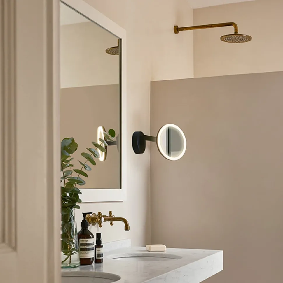 Vanity is een functioneel inrichtingselement voor de badkamer en garderobe. De ronde spiegel heeft een buitenring waarin warmwitte LED’s zijn geïntegreerd achter een satijnen afdekking. Met hun groothoeklicht, verminderde schittering en goede kleurweergave bieden ze de beste voorwaarden om elk detail te herkennen. Ook de drievoudige spiegelvergroting draagt daar in belangrijke mate toe bij. Bovendien kan het spiegeloppervlak dankzij de draaibare en zwenkbare bevestiging aan een arm precies op het gewenste oppervlak worden gericht.