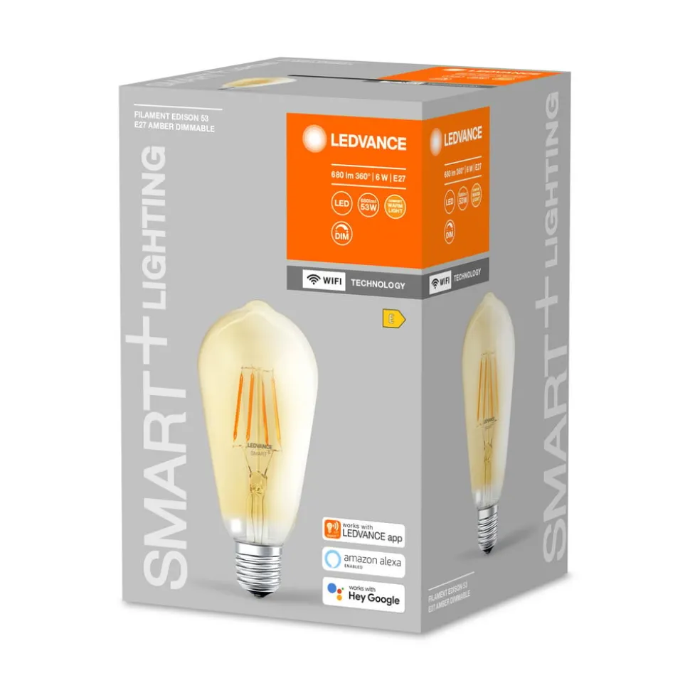 LEDVANCE SMART WiFi E27 LED lamp Edison Filament ST64 goud met 6W, warm wit, voor bediening via WLANSSmart bestuurbaar, warm wit licht voor conventionele armaturen wordt geleverd door deze WiFi-geschikte E27 ST64 LED filamentlamp Edison in rustieke vorm met goud getint glazen lampje. Schakelen en dimmen gaat via de app op de smartphone/tablet of met een spraakcommando. De koppeling met de tablet/smartphone of slimme integratie vindt plaats via het WLAN dankzij de SMART WiFi-technologie, zonder dat er een gateway of bridge nodig is. Speciale kenmerken/compatibiliteit: – bedienbaar met de LEDVANCE SMART WiFi app (gratis beschikbaar voor iOS en Android); maakt voorinstellingen en automatiseringen mogelijk – bediening via Google Assistant of Amazon Alexa mogelijk – dimbaar – lichtkleur: warm wit (2.400 K) – netwerkprotocol: WiFi