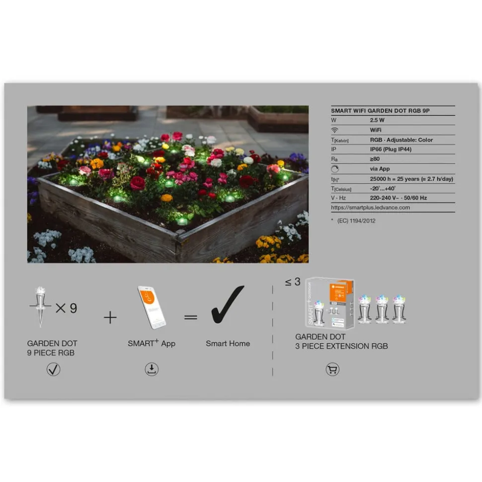 Negen slimme LEDVANCE SMART+ WiFi Garden Dot LED lampen voor kleurrijke accentverlichting De Garden Dot LED grondspies lamp zorgt voor kleurrijke lichtaccenten in de buitenruimte. Die negen in serie geschakelde lampjes zijn gemaakt van helder polycarbonaat. Ze worden gevoed via een gemeenschappelijke 230 V aansluiting en geïntegreerd via een regelkast met LEDVANCE SMART+ WiFi module. Deze maakt het mogelijk om de armaturen via WiFi te verbinden met een smartphone/tablet voor slimme bediening via een App of spraakbesturing. Via de accessoires zijn geschikte sets van drie verkrijgbaar voor uitbreiding tot een groep van maximaal 18 units. Technische gegevens / compatibiliteit: – Leveringsomvang: negen armaturen, één 230 V naar 5 V IP44 insteektransformator, één controllerbox, bekabeling – Bedienbaar met de LEDVANCE SMART+ WiFi-app (gratis verkrijgbaar voor iOS Assistant en Android); maakt voorinstellingen en automatisering mogelijk – Kan worden aangestuurd via Google Assistant of Amazon Alexa – Dimbaar – Lichtkleuren: ca. 16 miljoen kleurrijke tinten – Draadloos protocol: WiFi 2.412 – 2.484 GHz Die nieuwe LEDVANCE producten, voorheen bekend onder de merknaam OSRAM, combineren de hoogste kwaliteitsnormen met een modieus design.
