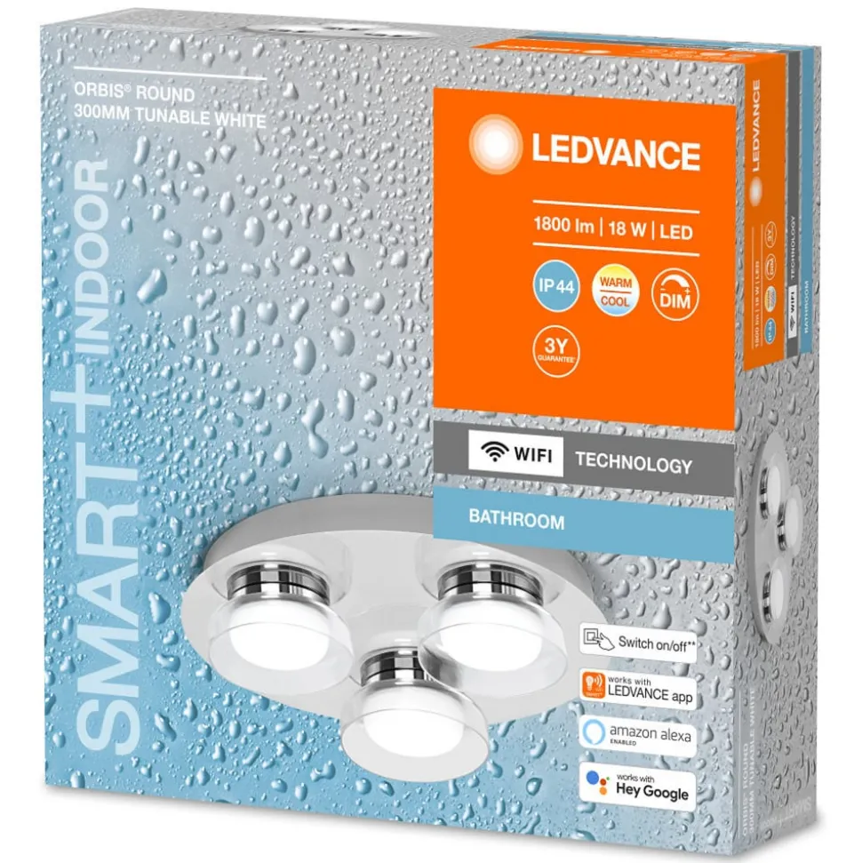 Dankzij haar beschermingsgraad IP44 kan de Orbis Wall Round LED plafondarmatuur probleemloos in de badkamer worden gebruikt. De armatuur heeft drie lichtbronnen, elk omgeven door een kleine kap. Orbis Wall Round straalt het licht naar de vloer zonder te verblinden. Dankzij het design in zilver en wit kan de armatuur gemakkelijk worden geïntegreerd in verschillende interieurstijlen. Helderheid en kleurtemperatuur kunnen worden geregeld via een app of stemcommando. De integratie gebeurt met de LEDVANCE SMART+ WiFi-technologie via WLAN.