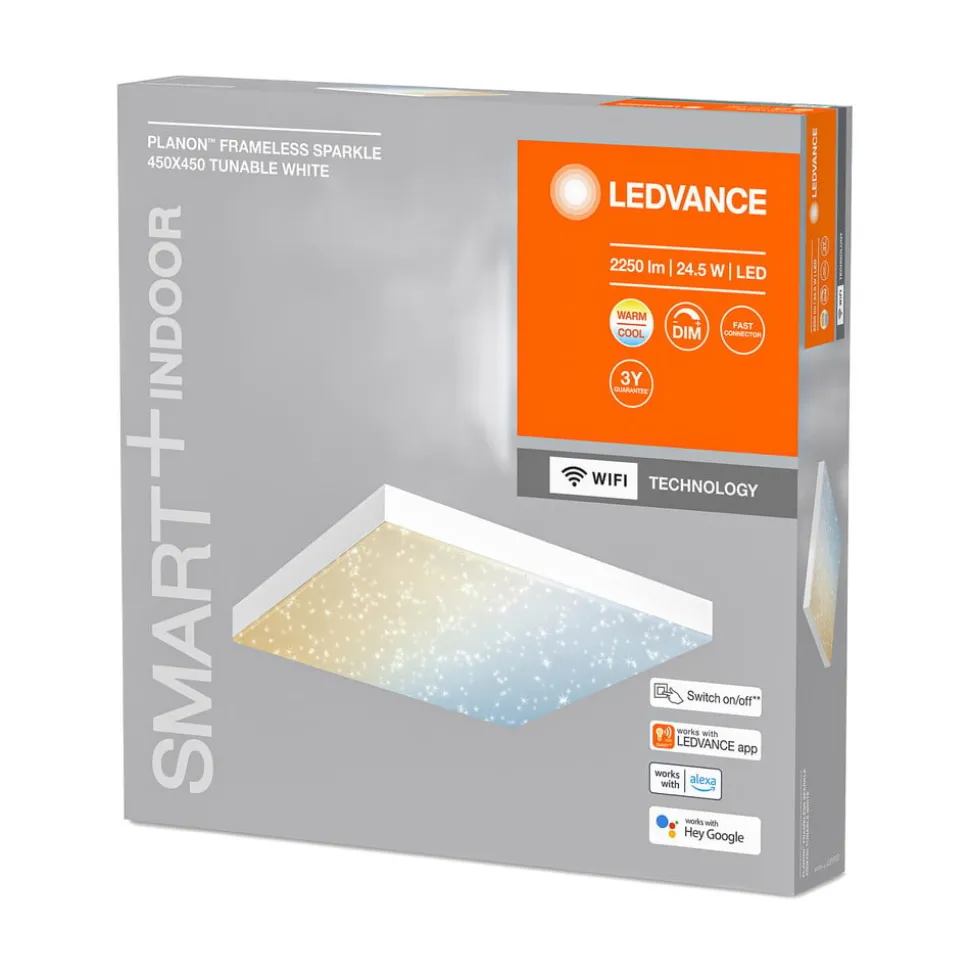 Planon FL Sparkle LED paneel met CCT functie en SMART WiFi technologieDe vlakke, hoekige Planon FL Sparkle LED plafondlamp kan slim worden aangestuurd dankzij WiFi technologie, namelijk na WLAN verbinding via tablet of smartphone met de LEDVANCE SMART WiFi app die gratis beschikbaar is voor Android en iOS apparaten. Spraakbesturing met Google Assistant of Amazon Alexa is ook mogelijk. Het paneel heeft een frameloos ontwerp en een kunststof deksel dat dankzij het fonkelende effect een fonkelende sterrenhemel in de kamer creëert. Helderheid en kleurtemperatuur kunnen worden aangepast aan de situatie. Het LED paneel is snel en eenvoudig te installeren, het complete installatiemateriaal wordt meegeleverd.- Dimbaar- Lichtkleur instelbaar: warm wit (3.000 K) tot daglicht (6.500 K)- Slimme integratie via WLAN- Bedienbaar via LEDVANCE SMART WiFi app- Spraakbesturing via Google Assistant of Amazon Alexa mogelijk