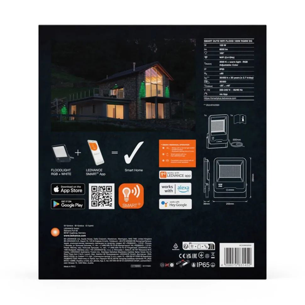 Technische kenmerken / compatibiliteit – bedienbaar via gratis LEDVANCE SMART WiFi-app; maakt presets en automatisering mogelijk – stembediening via Google Assistant of Amazon Alexa mogelijk (compatibel smart home-systeem vereist) – 16 miljoen kleurrijke lichtkleuren en wit licht (3.000 K) instelbaar – traploos dimbaar via app of stembediening – goed lichtrendement: 80 lm/W – netwerkprotocol: WiFi – Stofdicht en beschermd tegen waterstralen (IP65) – Temperatuurbereik: -20 tot 40 °C – Slagvastheid: IK06