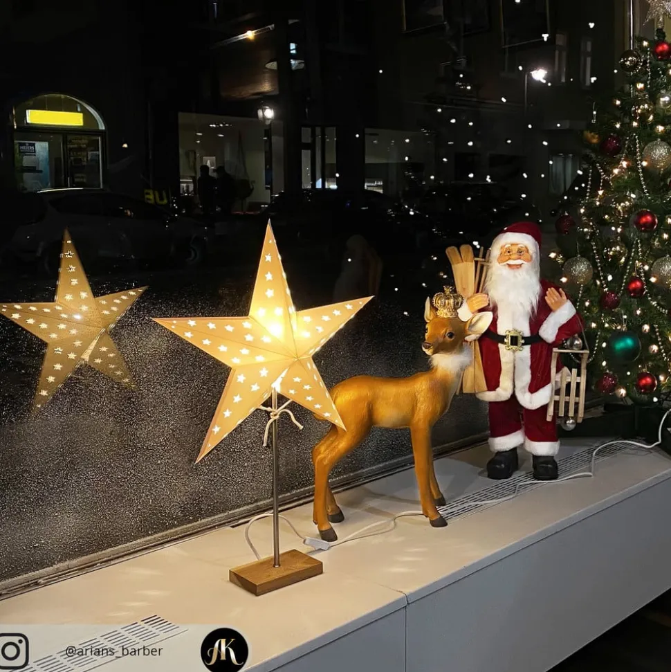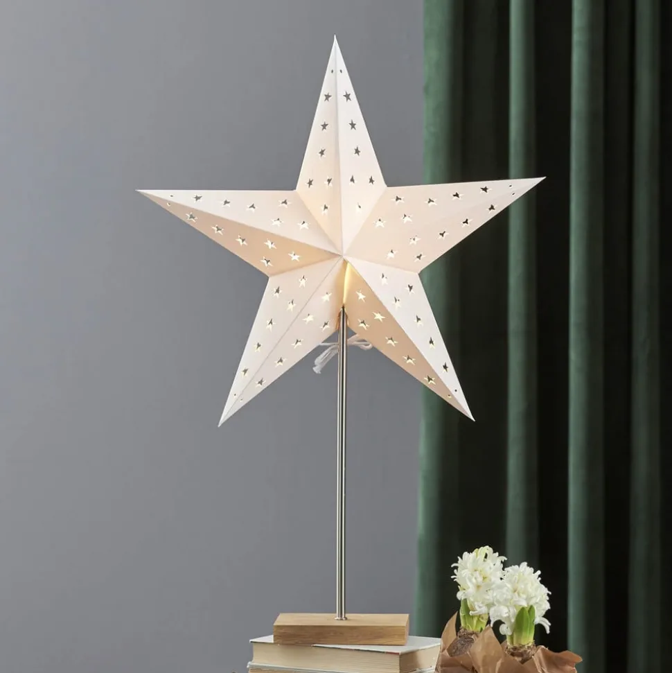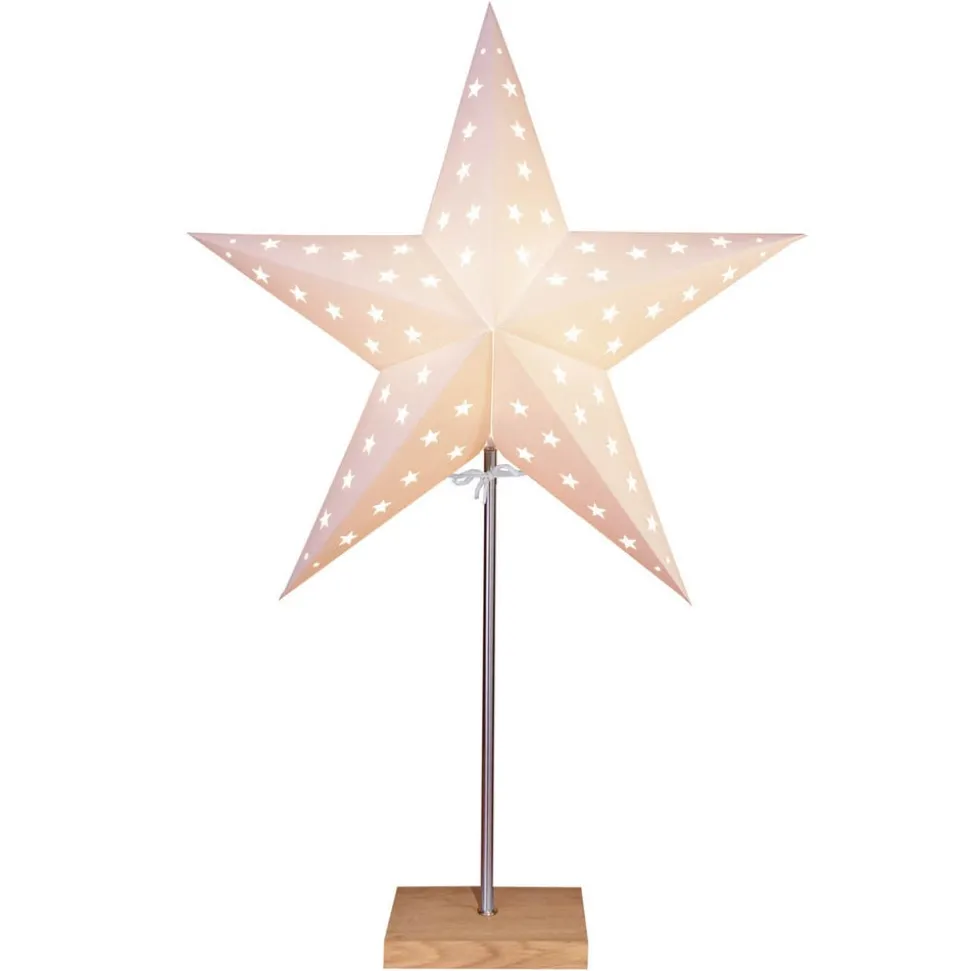 LEO – een vijfpuntige staande ster met een opengewerkt sterpatroon Deze fraai vormgegeven vijfpuntige papieren ster van LEO op een metalen frame en houten voet zal in elk huis snel een passende plaats vinden. Het witte papier van de ster is versierd met een patroon van talloze kleine sterren die uit het papier zijn gestanst. Hierdoor kan het licht van de Lamp in alle richtingen ontsnappen door de kleine uitsparingen, wat een gezellige Flair in de kamer creëert. Passende lampen vind je onder accessoires.