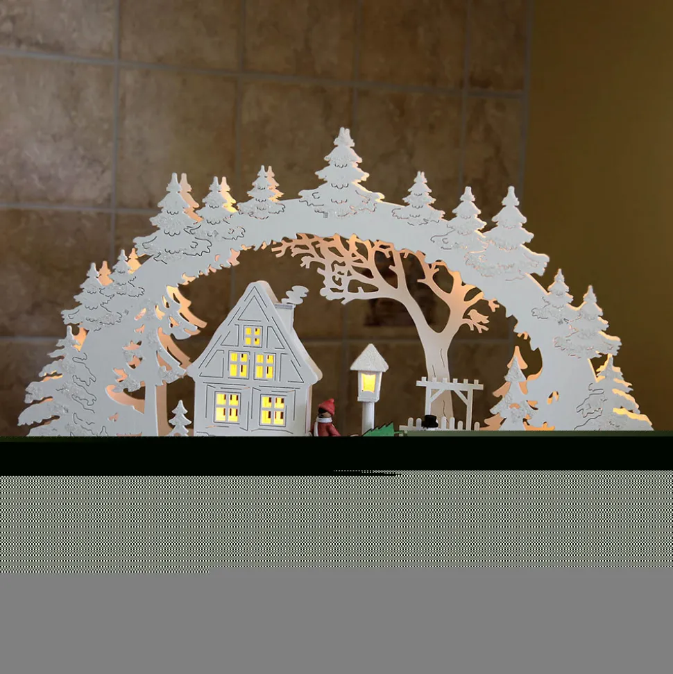 Met een mooi winters dorpstafereel en door de kerstachtige lichtglans, is LED-lichtboog Village voor en tijdens kerst een versiering voor kasten, dressoirs en tafels, maar vooral ook voor het raam. Niet alleen het winterse bos dat als boog is uitgewerkt, maar ook het huisje en de lantaarns worden met warm-wit licht door LED’s verlicht. De transformator is bij de levering inbegrepen. Incl. aansluitsnoer met stekker (5 m). Ook met batterijen te gebruiken
