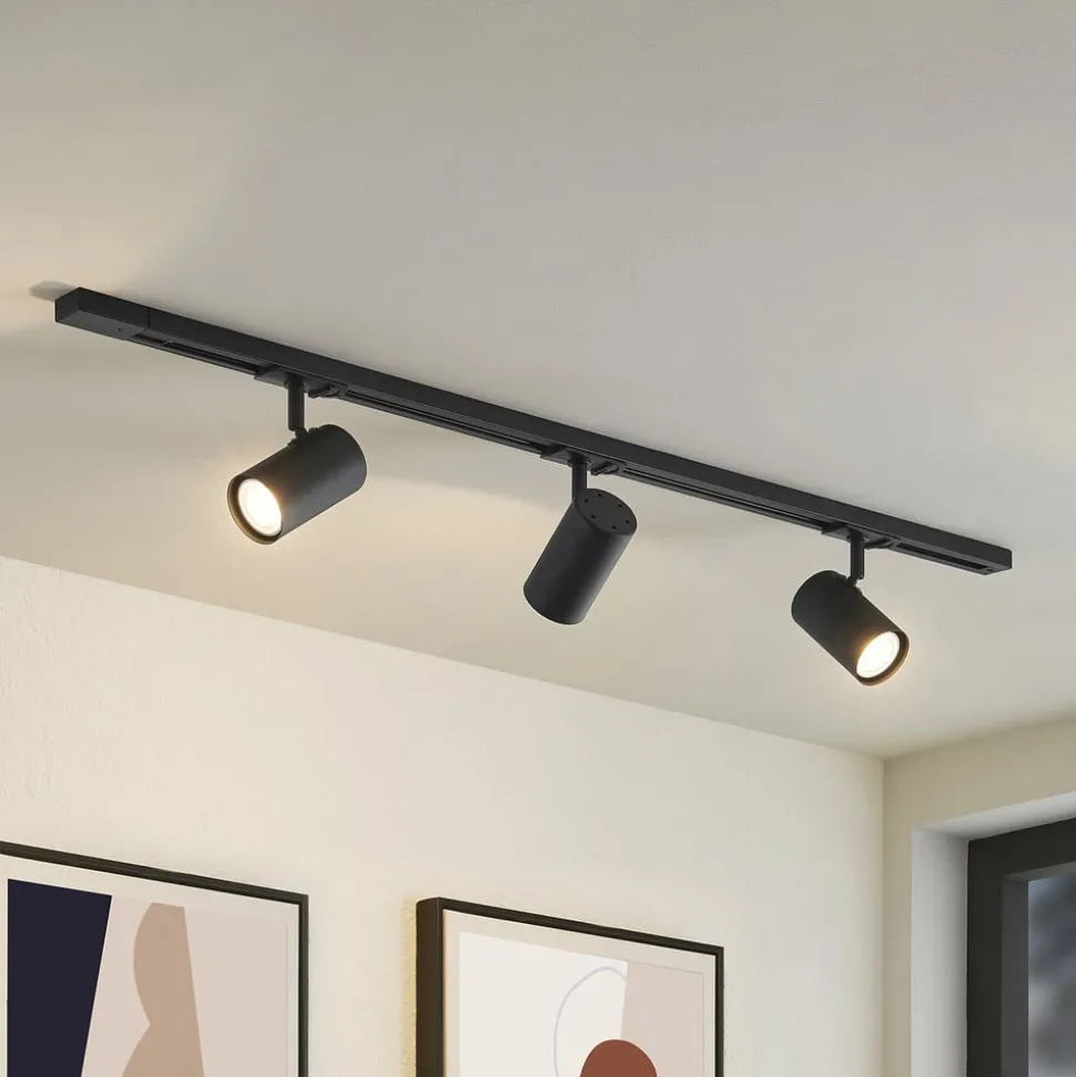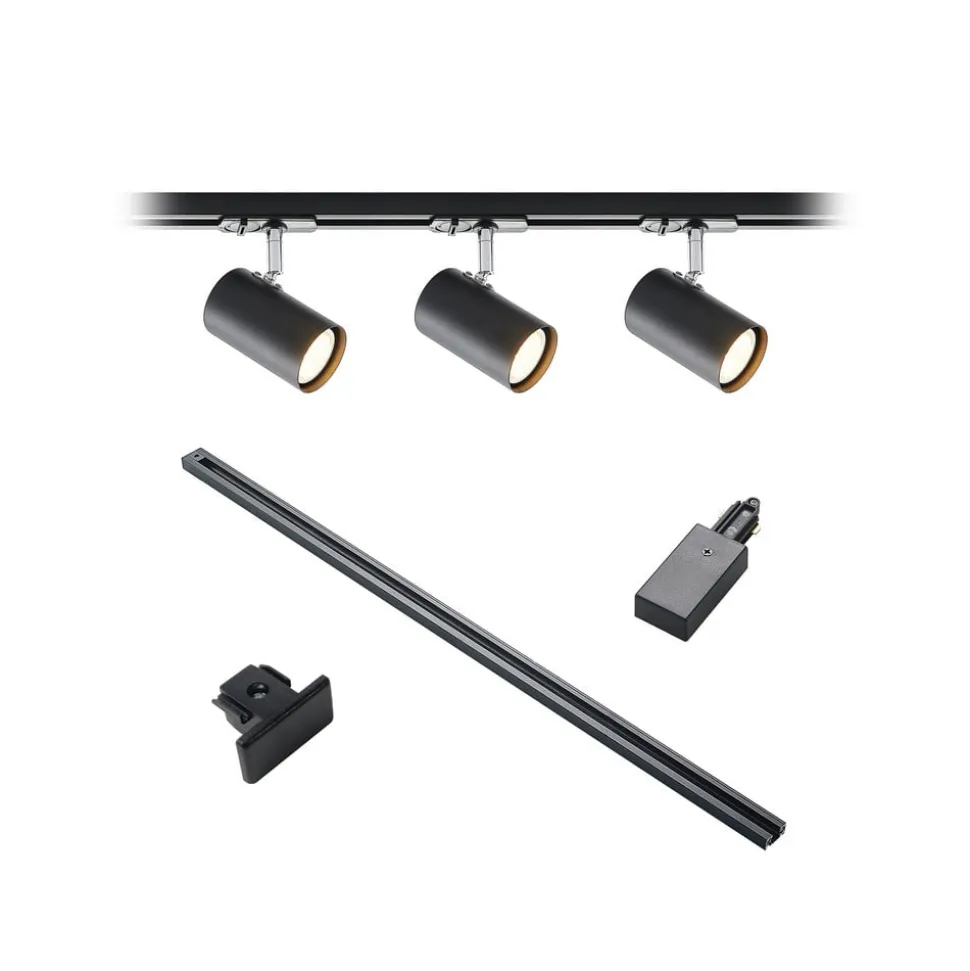 Zwarte Linaro railsystem set inclusief drie railspots Het railsystem heeft een strakke, zwarte kleurstelling en is gemaakt van metaal en kunststof. De set bestaat uit een stroomrail, drie railspots, een eindvoeding en een eindkap. Het 1-fase railsysteem is 1 meter lang en maakt flexibele plaatsing van de spots mogelijk. De drie spots hebben GU10 fitting en kunnen specifieke gebieden in de kamer verlichten. De eindvoeding dient als aansluitpunt voor het railsystem en de eindkap sluit het systeem af en zorgt voor een esthetische afwerking. Linaro is perfect voor woonkamers, keukens of eetkamers. Het biedt niet-verblindende verlichting en kan individueel worden uitgelijnd. Het eenvoudige ontwerp past naadloos in verschillende kamerconcepten. Let op: het Linaro railsysteem is alleen compatibel met accessoires uit het Linaro assortiment. Om verwarring met andere systemen te voorkomen, combineer je best enkel accessoires en railsystemen uit de gelijknamige serie.