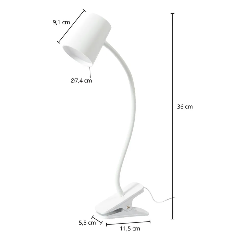 - Klemvoet – breedte 5,5 cm, lengte 11,5 cm; lampenkop – breedte 7,4 cm, lengte 9,1 cm