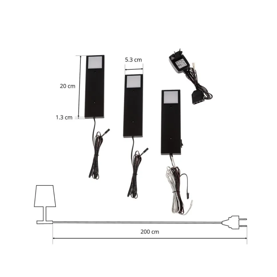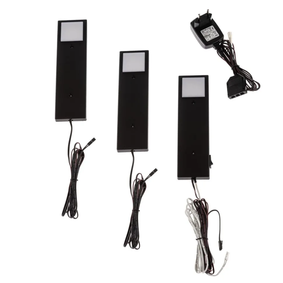 Zwarte LED meubelverlichting Amaryll in een praktische set van 3 De LED meubelverlichting Amaryll kan bijna overal worden geïnstalleerd en is bijzonder praktisch als verlichting voor kledingkasten of keukenkasten. De lamp wordt geleverd in een set van 3 en geeft een warmwit licht dat zeer aangenaam is voor het oog. De permanent geïnstalleerde LED modules zijn zowel helder als energiebesparend. Het ontwerp van deze onderbouwlamp past perfect in moderne huishoudens. De rechthoekige vorm en zwarte afwerking zijn niet opdringerig en passen goed in verschillende omgevingen.