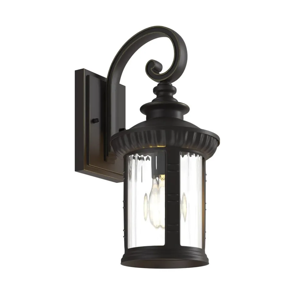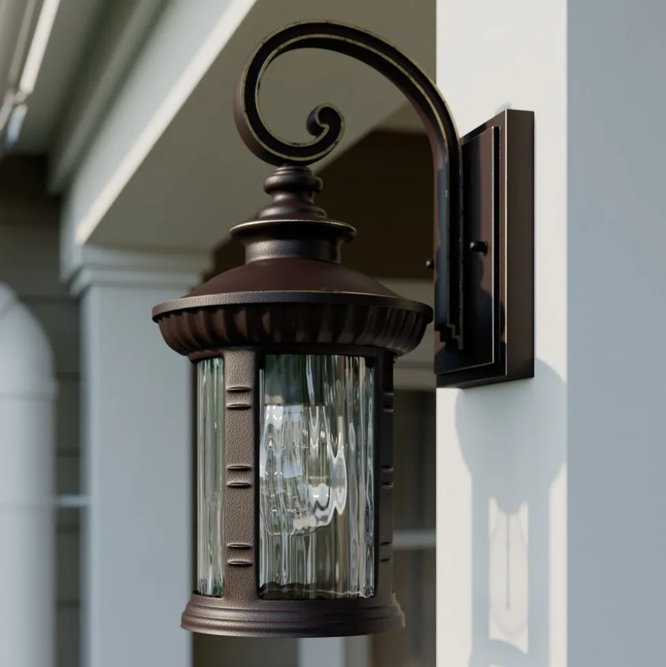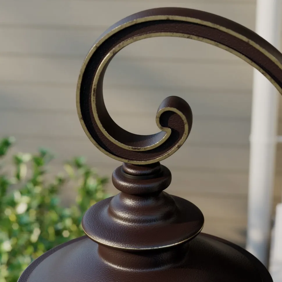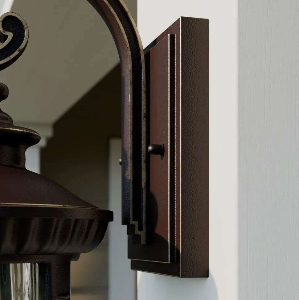 Decoratieve buitenwandlamp Barret in bruin met gouden accenten De nostalgische en antieke charme van de buitenlamp Barret wordt gecreëerd door de vorm en het harmonieuze kleurenschema. De kap van de lamp hangt hier naar beneden in een soort lantaarn, die een heldere glazen kap heeft met een licht golvend oppervlak. Kleine decoraties en details, waaronder de gouden randen, ronden het designensemble van deze buitenwandlamp af en zorgen voor een echte blikvanger, bijvoorbeeld bij de ingang van het huis of op het terras. Ook in het donker verlicht Barret de omgeving veilig en betrouwbaar en baadt alles in een aangenaam licht.