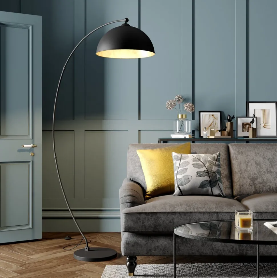 Aantrekkelijke vloerlamp Jonera in een boogvorm met een zwarte en gouden kap Jonera past bij moderne woonstijlen en toont een duidelijk minimalisme, omdat het ontwerp van de boogvormige vloerlamp bewust het gebruik van overdreven gedetailleerde elementen vermijdt. De basis van de vloerlamp is rond, van waaruit een smal, gebogen element naar de kap leidt. Deze heeft de vorm van een halve bol en is aan de buitenkant matzwart geschilderd, terwijl de binnenkant een matgouden glans heeft. Zwart en goud zijn kleuren die bijzonder goed bij elkaar passen en daarom wordt deze combinatie steeds populairder in de verlichtingssector. Kappen die aan de binnenkant goudkleurig zijn, zorgen ook voor een bijzonder warme gloed omdat ze bijzonder knusse reflecties creëren – een eersteklas keuze als aanvulling op de woonkamer! De voetschakelaar bevindt zich in de voedingskabel van de vloerlamp, zodat Jonera gemakkelijk kan worden in- en uitgeschakeld.