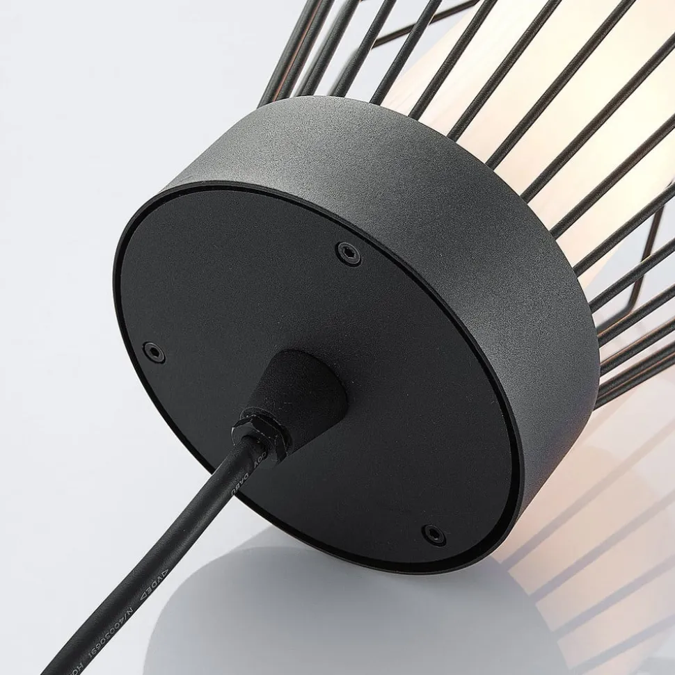 Buiten hanglamp Vajana met kooivormige kap en witte kunststof binnenkap Vajana kan buiten worden gebruikt als decoratieve lichtbron voor overdekte patio’s en balkons. De hanglamp wordt bediend met een E27 lamp naar keuze en combineert een kooikap met een kunststof kapinzetstuk van polycarbonaat, dat het licht zo zacht en gelijkmatig mogelijk verspreidt en ook de lamp beschermt.